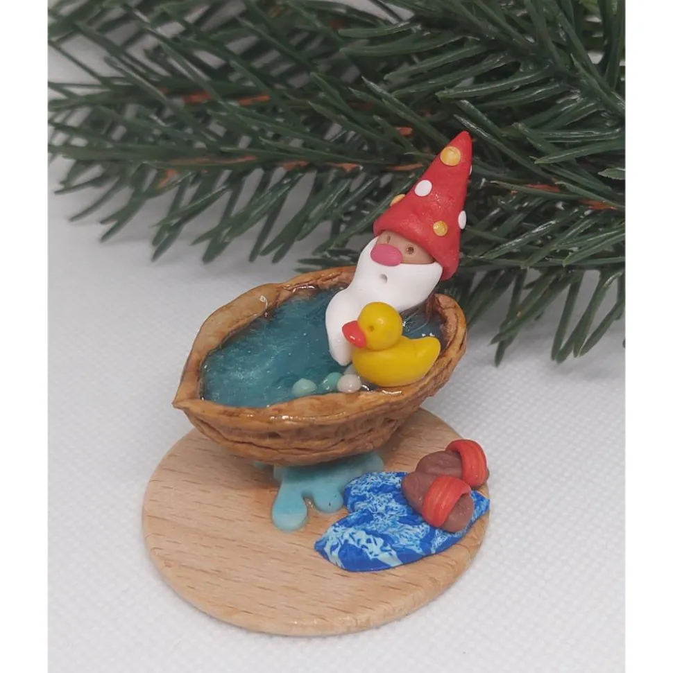 Diese liebevoll handgefertigte Miniatur zeigt einen fröhlichen kleinen Wichtel, der ein entspannendes Bad in einer Walnussschale genießt. Mit seiner rot/golden (wirkt da durch organe) Zipfemütze die mit weißen und golden Punkten verziert ist, dem langen weißen Bart und einem gelben Quietscheentchen an seiner Seite verbreitet er sofort gute Laune. Die Walnussschale ist mit türkis glitzernden Epoxidharz gefüllt, das wie schimmerndes Wasser wirkt. Auf einer kleinen Holzplatte arrangiert, komplettieren ein blaues blattförmiges Badetuch sowie passende kleine Badelatschen das Szenenbild.