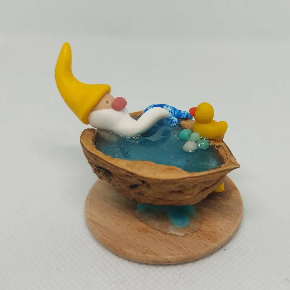 Diese liebevoll handgefertigte Miniatur zeigt einen fröhlichen kleinen Wichtel, der ein entspannendes Bad in einer Walnussschale genießt. Mit seiner sonnengelben Zipfelmütze, dem langem weißen Bart und einem gelben Quietscheentchen an seiner Seite verbreitet er sofort gute Laune. Die Walnussschale ist mit türkis glitzerndem Epoxidharz gefüllt, das wie schimmerndes Wasser wirkt. Auf einer kleinen Holzplatte arrangiert, komplettieren ein blattförmigen Badetuch in blau/weiß, sowie passenden kleinen Badelatschen in gelb das charmante Szenenbild.