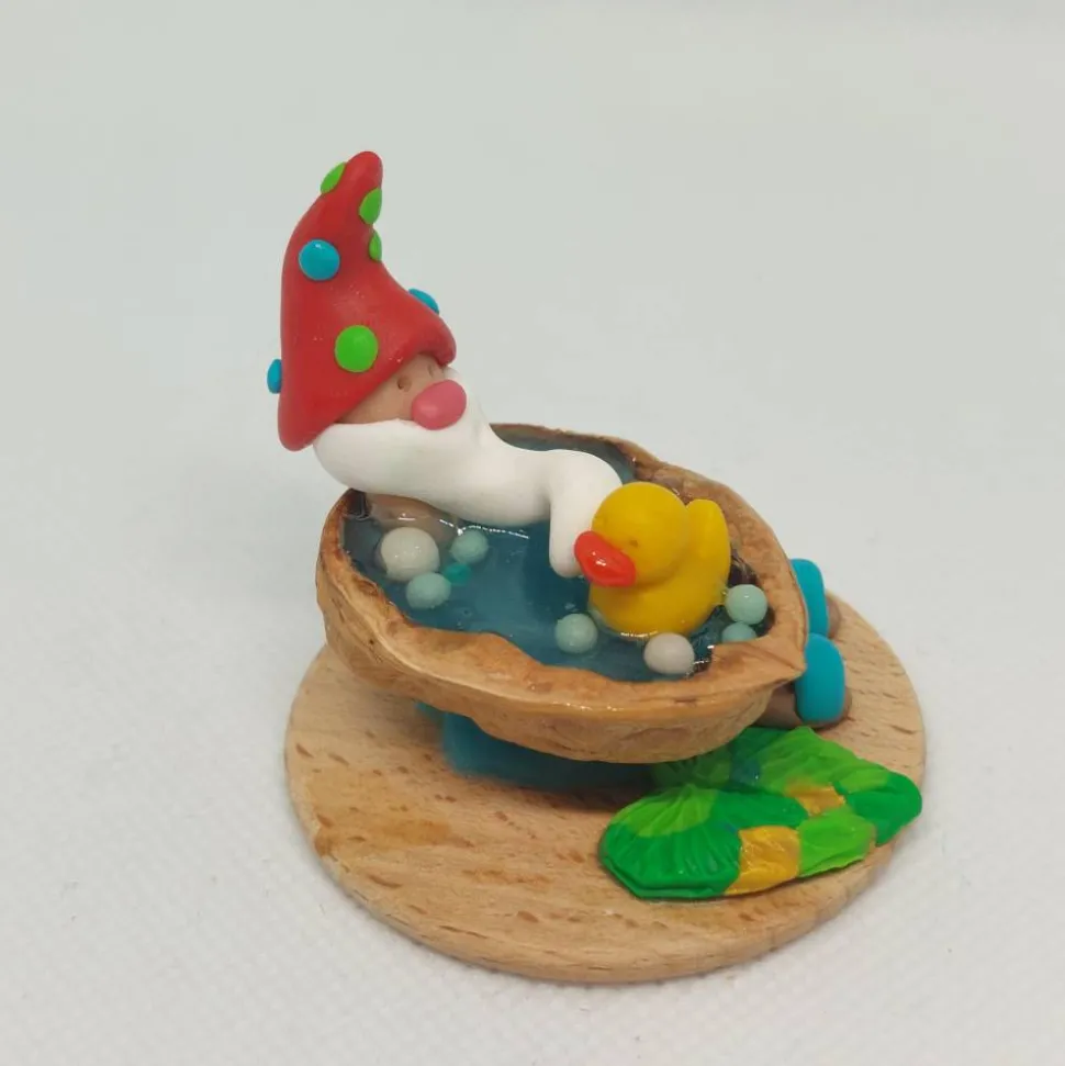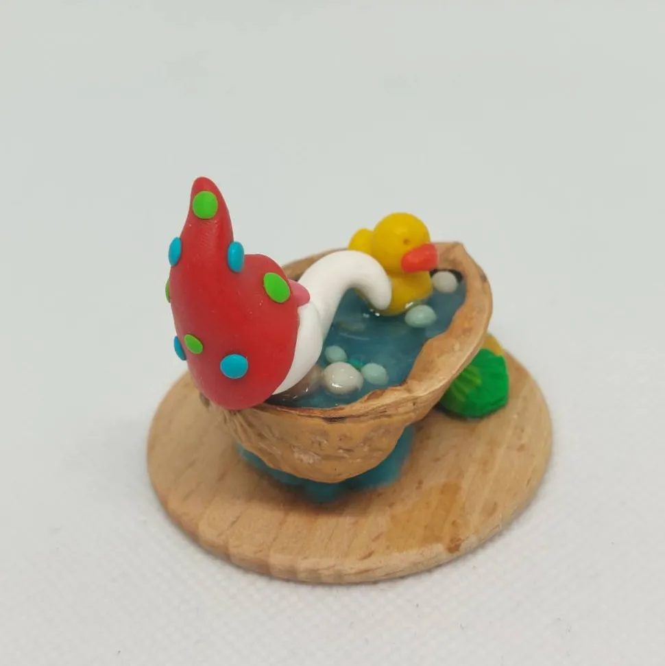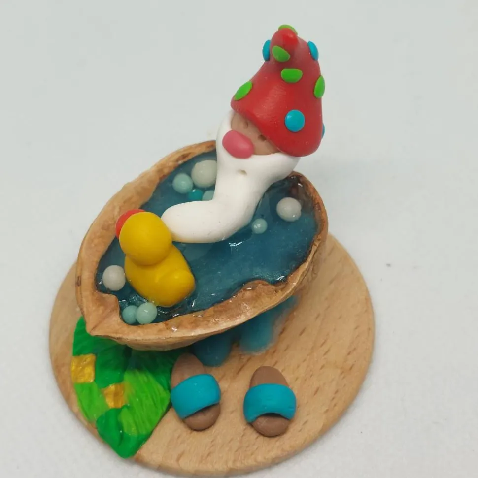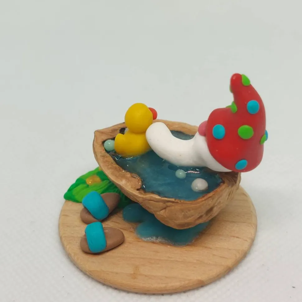Diese liebevoll handgefertigte Miniatur zeigt einen fröhlichen kleinen Wichtel, der ein entspannendes Bad in einer Walnussschale genießt. Mit seiner rot Zipfemütze die mit grün und blaien Punkten verziert ist, dem langen weißen Bart und einem gelben Quietscheentchen an seiner Seite verbreitet er sofort gute Laune. Die Walnussschale ist mit türkis glitzernden Epoxidharz gefüllt, das wie schimmerndes Wasser wirkt. Auf einer kleinen Holzplatte arrangiert, komplettieren ein blattförmige Badematte, sowie passende kleine Badelatschen das Szenenbild.