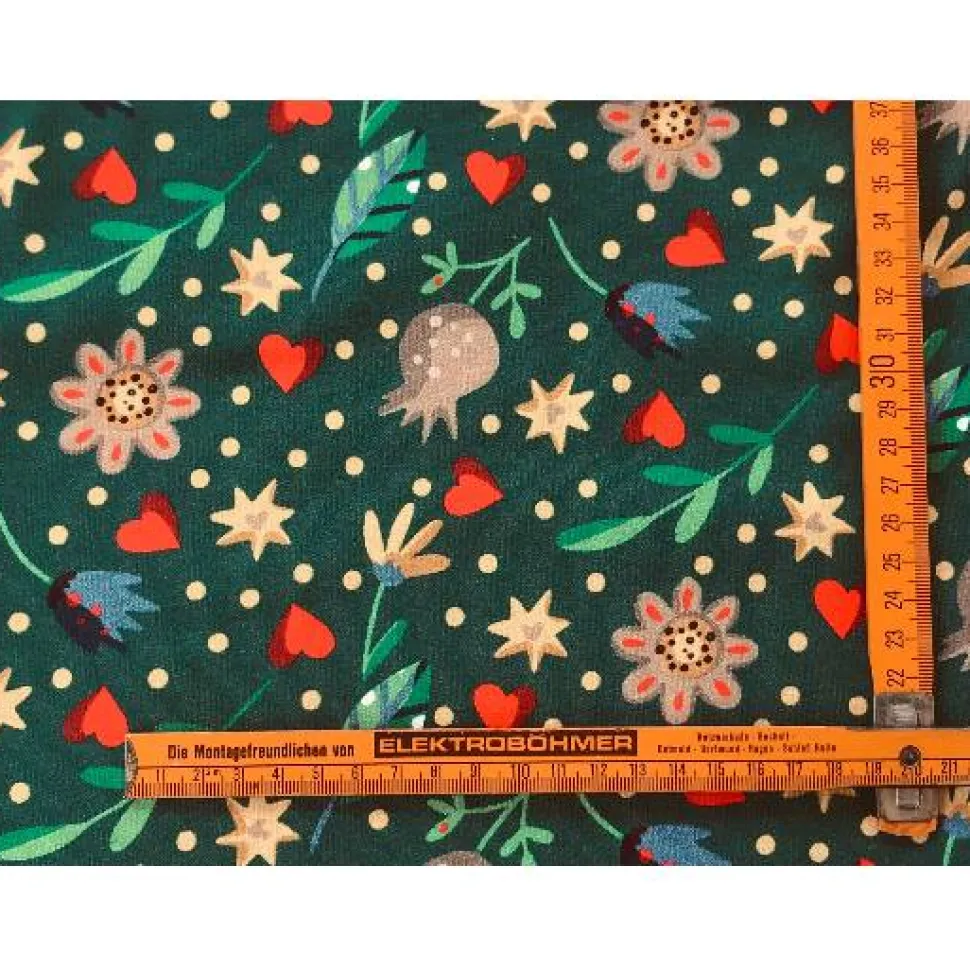 -> Der Kombistoff hat viele Blüten, Herzen, Zweige. Die Farben sind hell- und dunkelgrün, gelb, rot, hellbraun, dunkelblau und jeansblau. Die Grundfarbe ist dunkelgrün/tannengrün.