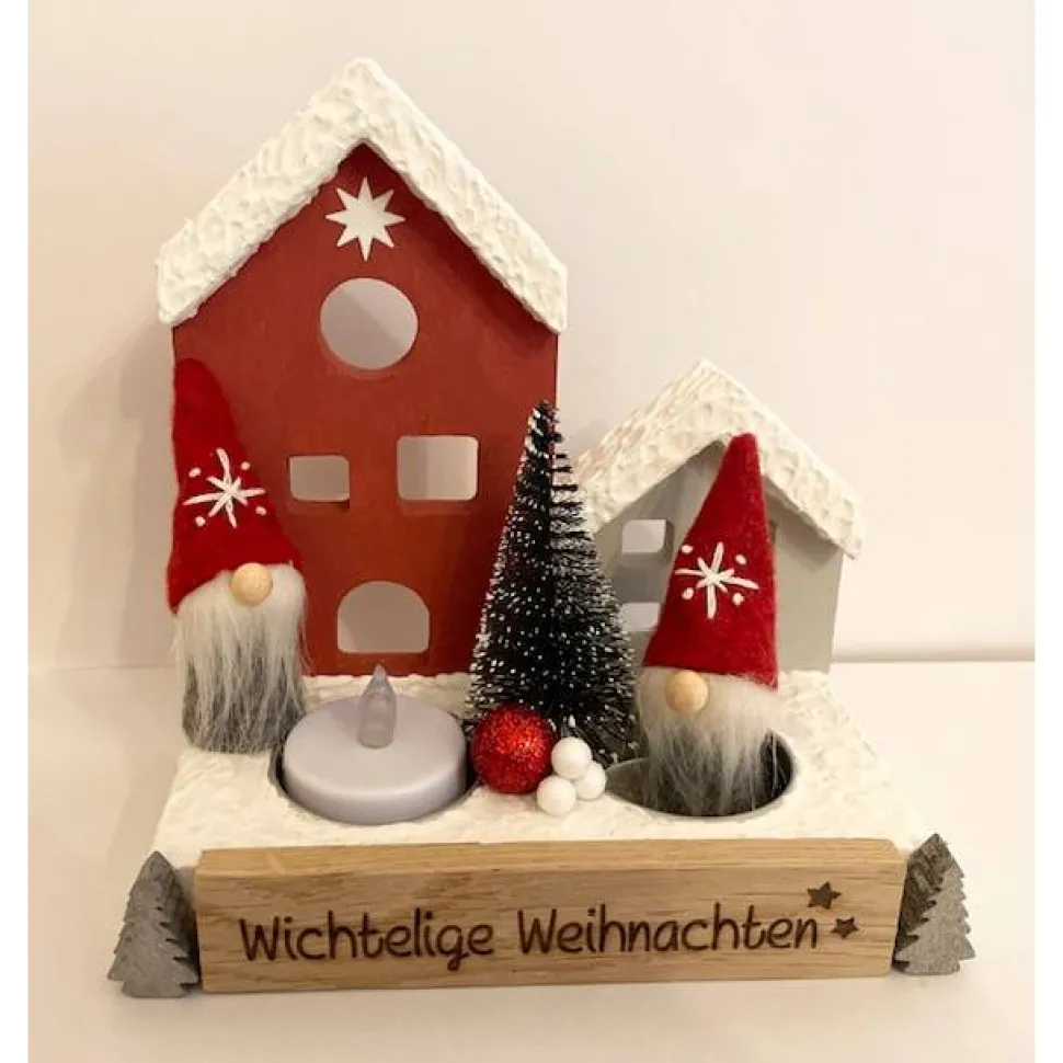 Dieses liebevoll gestaltete Wichtelhäuschen mit Teelichthalter ist eine süße Weihnachtsdeko. Die Häuschen sind in grau und dunkelrot handbemalt und die Dächer sowie die Fläche vor dem Häuschen sind mit Schnee verziert. Zwei kleine Wichtel in rot und grau, ein Tannenbaum, ein Stern und kleine Kugeln setzen schöne Akzente. Das integrierte Teelicht sorgt für stimmungsvolles Licht. Auf dem Klötzchen vor den Häuschen steht der Wunsch: Wichtelige Weihnachten.