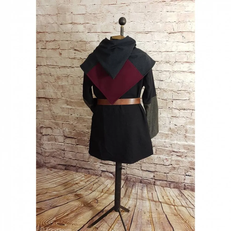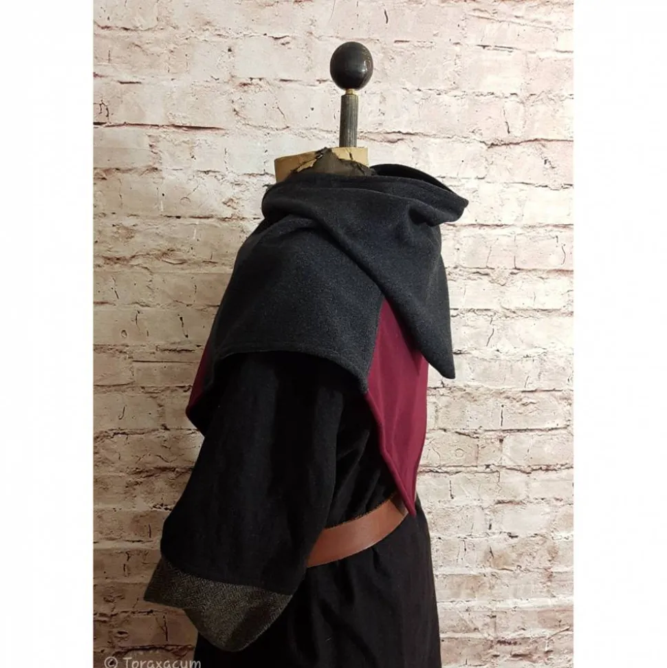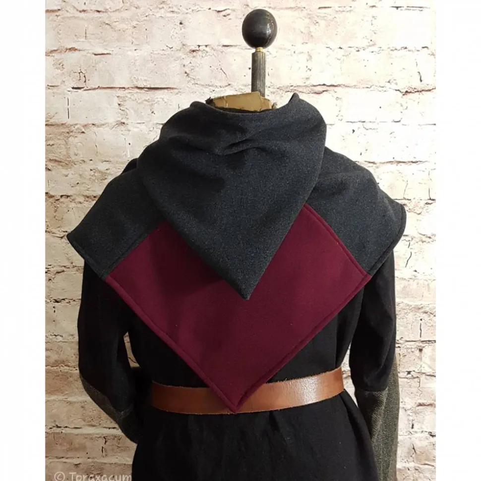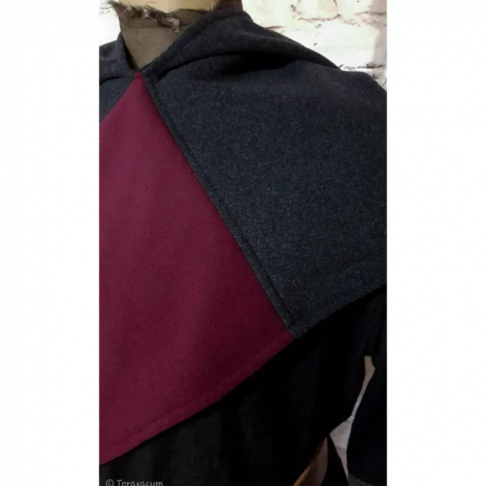 Wikinger Gugel aus weichem Wollstoff in dunkelgrau und bordeaux.