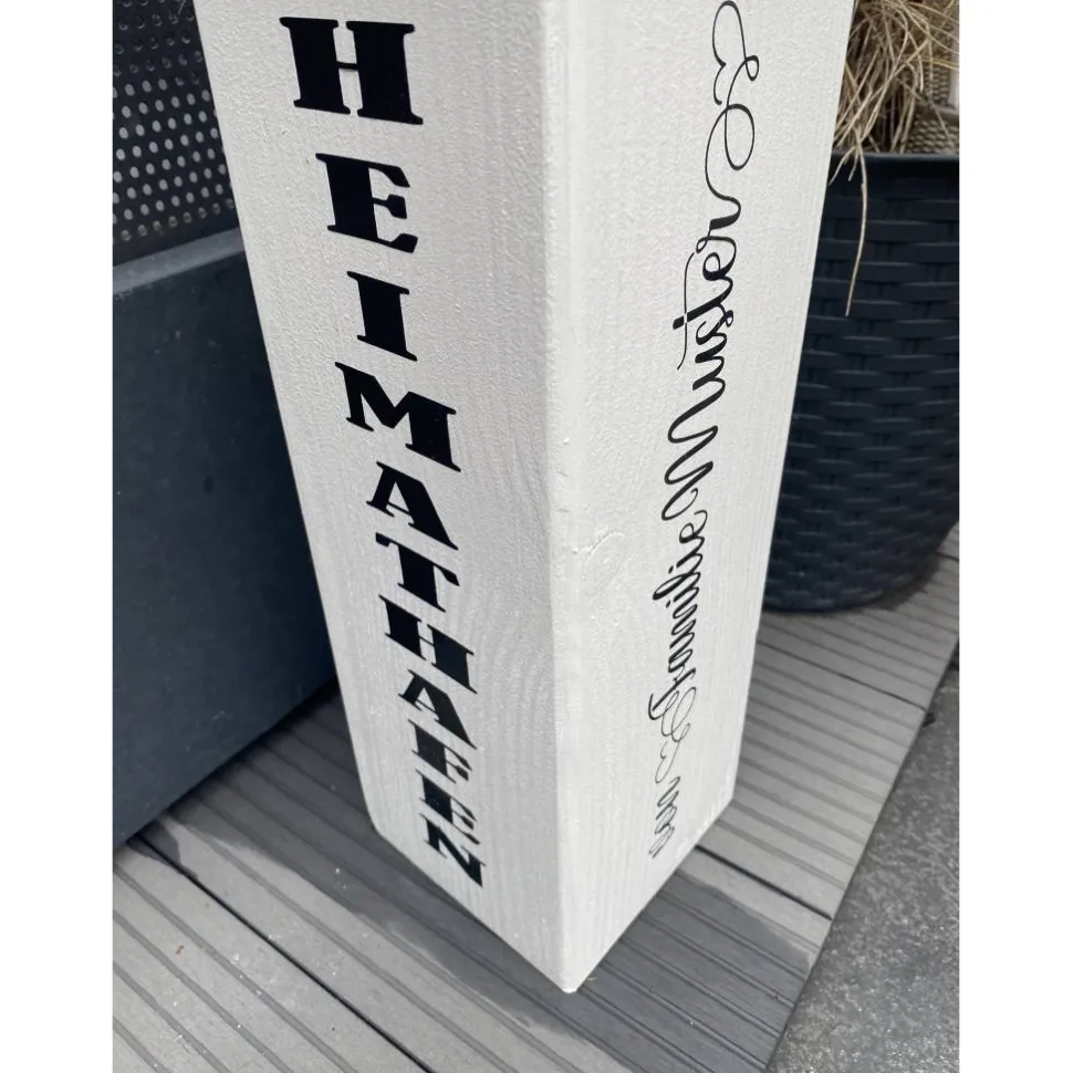 Wähle zwischen verschiedenen Höhen – 50 cm, 60 cm, 70 cm oder 80 cm – und genieße die hochwertige Verarbeitung: Die Säule misst ca. 10 × 10 cm, ist geschliffen, lackiert und wetterbeständig. Die Schrift besteht aus langlebiger Vinylfolie, verschiedene Farben und Schriftarten stehen dir zur Auswahl. Ein authentisches Seil rundet das maritime Design ab.