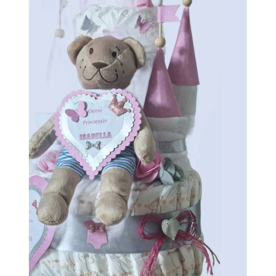 Diese liebevoll handgefertigte Windeltorte besticht durch ihr elegantes Weiß- und Rosa-Farbschema und ist speziell für neugeborene Mädchen gestaltet. Das Highlight ist das aufwendig gearbeitete Windelschloss mit einer hübschen Schleife – ein echter Hingucker auf jeder Babyparty.