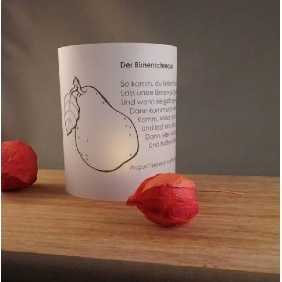Stimmungsvolles Windlicht mit einem Herbst-Gedicht. Genau richtig, wenn die Tage wieder gemütlicher werden.“Der Birnenschmaus – So komm, du lieber Sonnenschein,Lass unsre Birnen gut gedeih’n! Und wenn sie gelb geworden sind,Dann komm und wehe, lieber Wind!Komm, Wind, und schüttle jeden Ast Und lad‘ uns alle samt zu Gast! Dann eilen wir zum Haus hinaus Und halten einen Birnenschmaus. – August Heinrich Hoffmann von Fallersleben(1798-1874)“ Das Windlicht ist individuell auf sehr festes Transparentpapier gedruckt.Ihr erhaltet das Windlicht fertig vorbereitet und müsst nur noch die beiden Enden mit dem bereits aufgebrachten transparenten Klebestreifen zusammenfügen. Kein Flüssigkleber-Verschmieren!Für alle, die gerne öfter umdekorieren und einfach zu wenig Platz für die vielen schönen Dekoartikel haben, biete ich auch die „mobile“ Windlichtvariante an. Hierbei einfach bei Eurer Bestellung Bescheid geben, dann lasse ich den Klebestreifen weg und Ihr erhaltet stattdessen eine Foldback-Klammer. Mit dieser könnt Ihr das Windlicht zusammenklammern, wenn es zum Einsatz kommen soll. Danach lässt es sich sehr platzsparend (am besten in dem Umschlag, in dem Ihr es von mir erhaltet) aufbewahren.Egal ob nun mit Klebestreifen oder Klammer: zusammenheften, Teelicht oder LED-Licht hinein und viel Freude mit Eurem „Lyrical Light“!