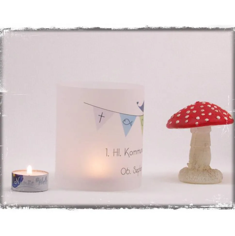 Ein Kommunionlicht / Windlicht mit den christlichen Symbolen Kreuz, Fisch, Herz, Wasser und Taube. Für Jungen hüpft ein süßes blaues Vögelchen auf der Wimpelkette umher. Darunter der Name des Kommunionkinds und das Kommuniondatum.