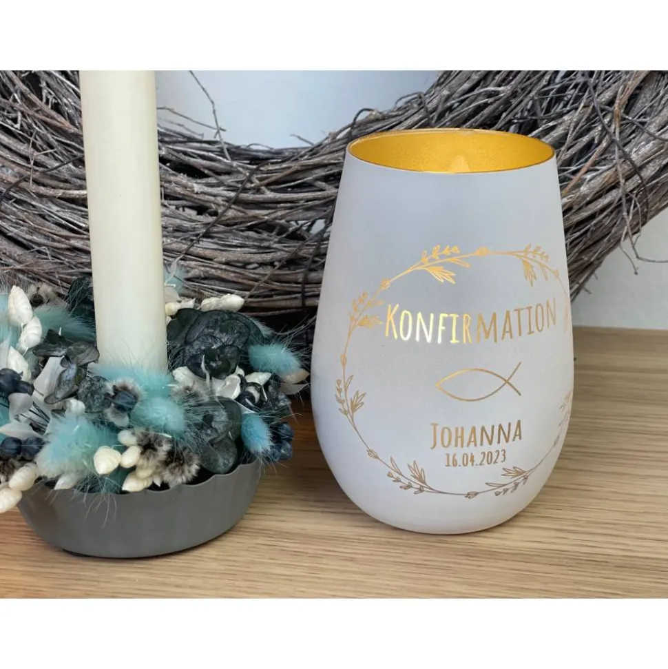 Durch die Gravur schimmert das Kerzenlicht in der gewählten Beschichtung.