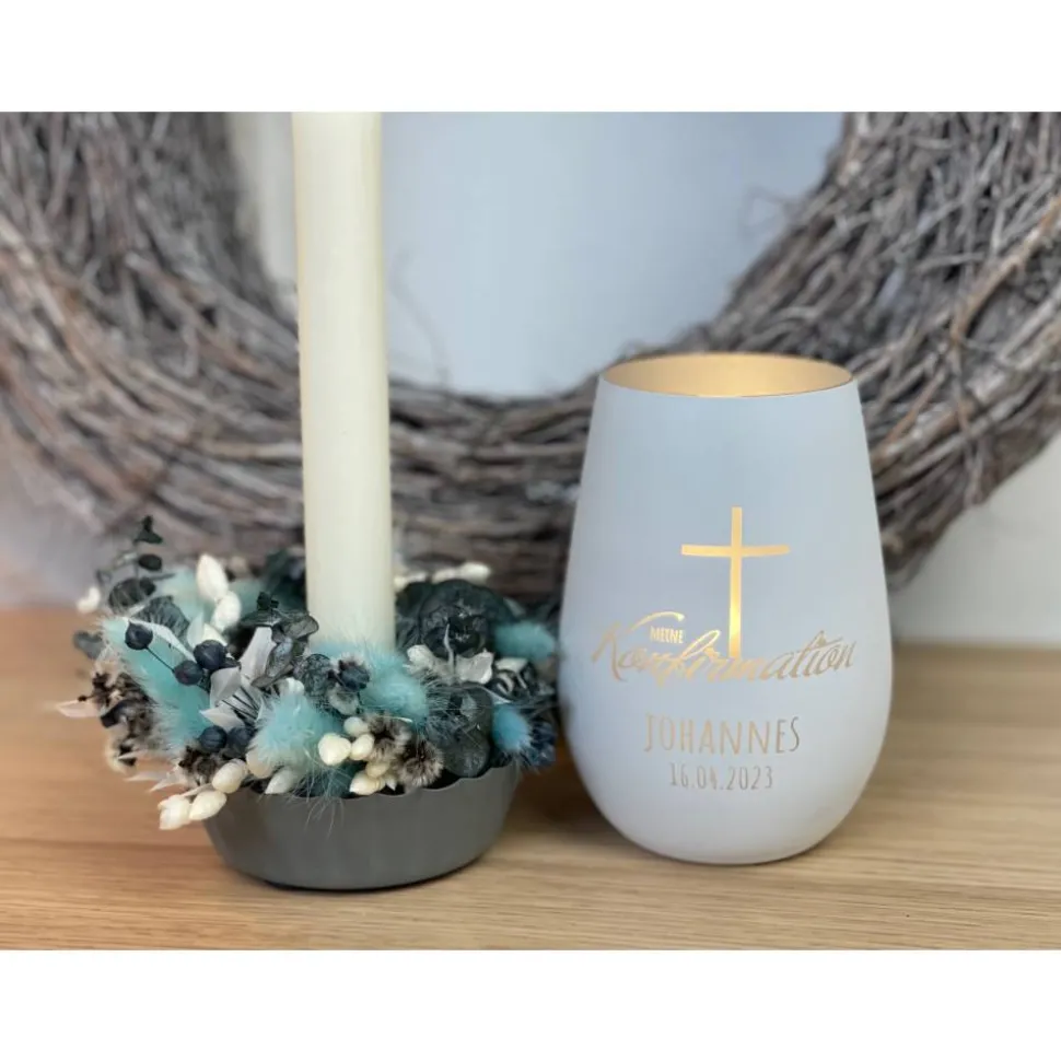 Durch die Gravur schimmert das Kerzenlicht in der gewählten Beschichtung.