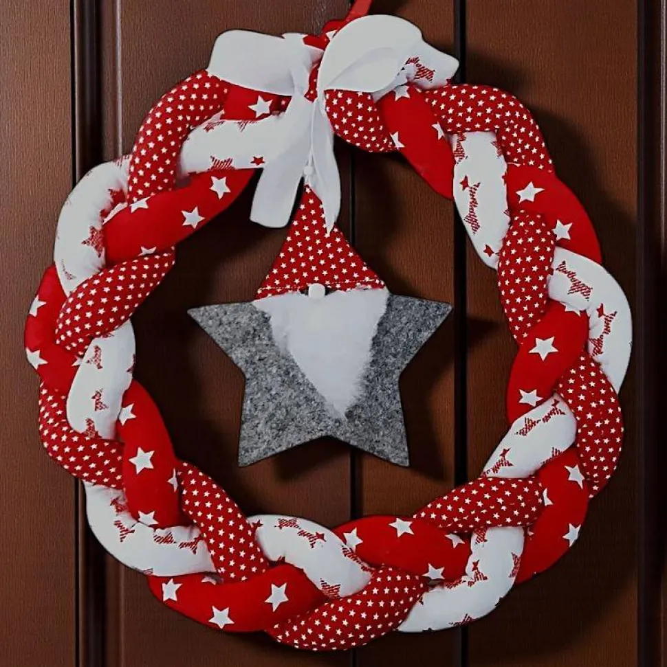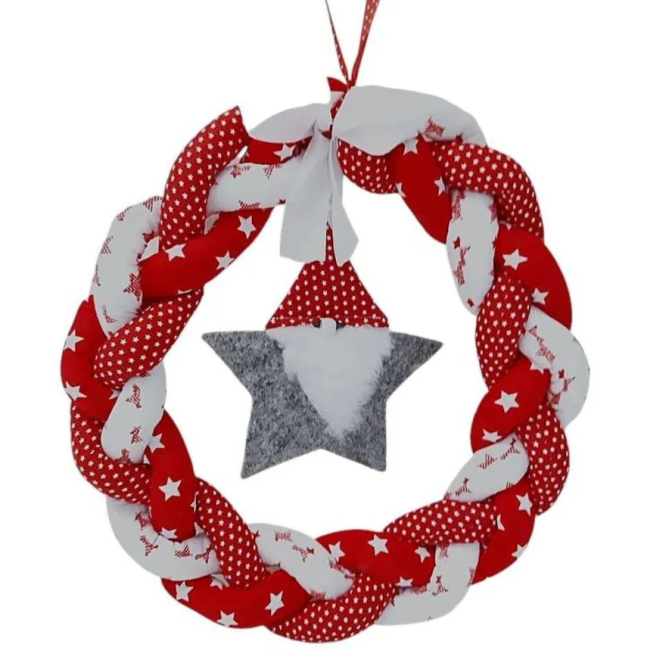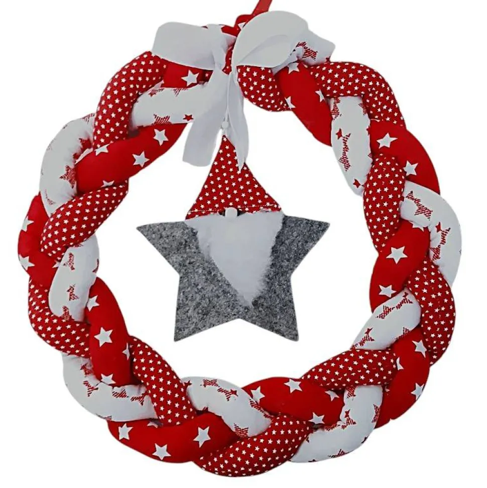 Dieser entzückende Tür Kranz ist ein echter Blickfang. Durch die drei mit Watte befüllten und verflochtenen Stoffstränge, ist dieser winterliche Dekokranz ein echtes Highlight. In der Mitte ziert den Kranz ein süßer Wichtel in Sternform. Eine schöne Deko auch zur Weihnachtszeit.
