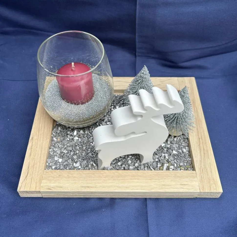 Winterliches Deko-Tablett mit Rentier, Kerzenglas & Silberakzenten – stilvolle Weihnachts- und Winterdeko