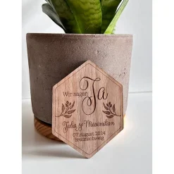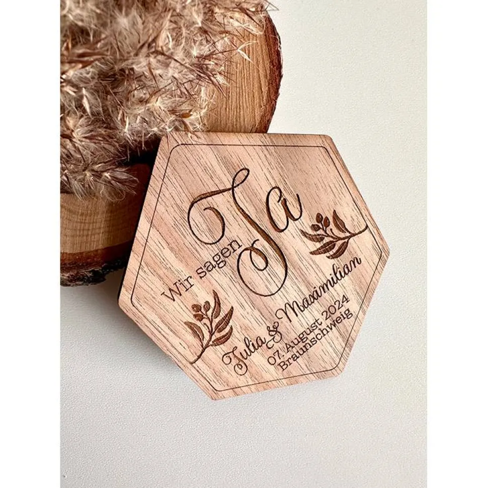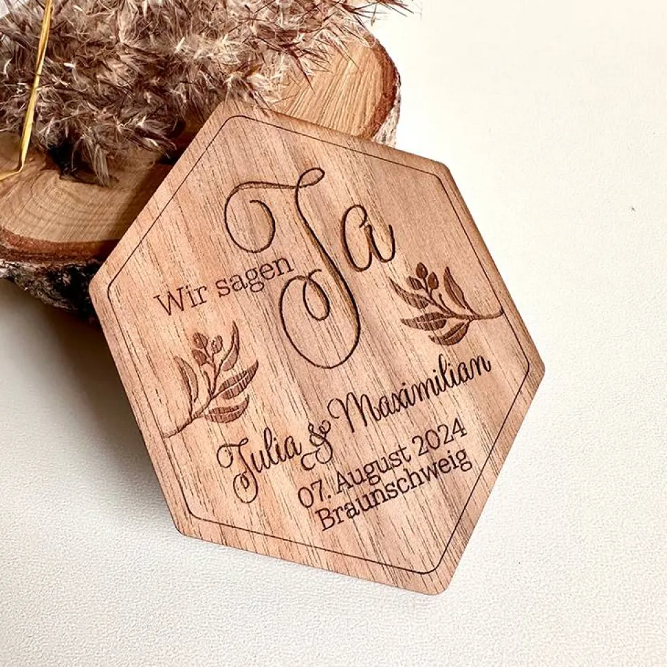 Die „Wir sagen Ja“ Magnetkarten aus Holz sind eine originelle Möglichkeit, euer Hochzeitsdatum zu verkünden.