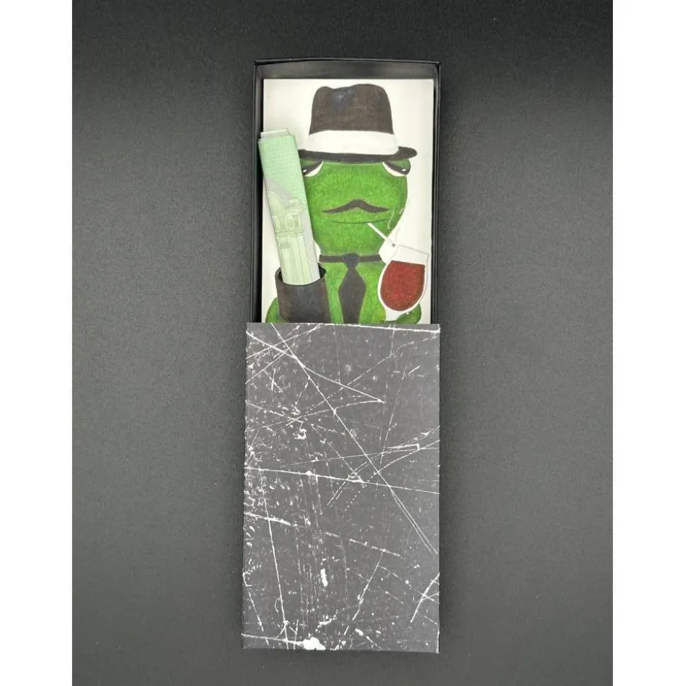 Du suchst eine außergewöhnliche Geschenkverpackung für eine Essenseinladung oder einen Gutschein? Dann ist unsere Mafiosi-Frosch-Box die perfekte Wahl! Das handgemalte Motiv ist im Inneren der Schiebeschachtel versteckt und sorgt garantiert für einen Lacher: Ein Frosch im Mafiosi-Look – mit schwarzer Krawatte, elegantem Hut, Zigarette im Mund und Glas Rotwein in der Hand – hält in der anderen Hand eine schwarze Box, in die du eine handgeschriebene Einladung, einen Gutschein zum Essen (beispielsweise für ein italienisches Restaurant) oder einen Geldschein einstecken kannst.