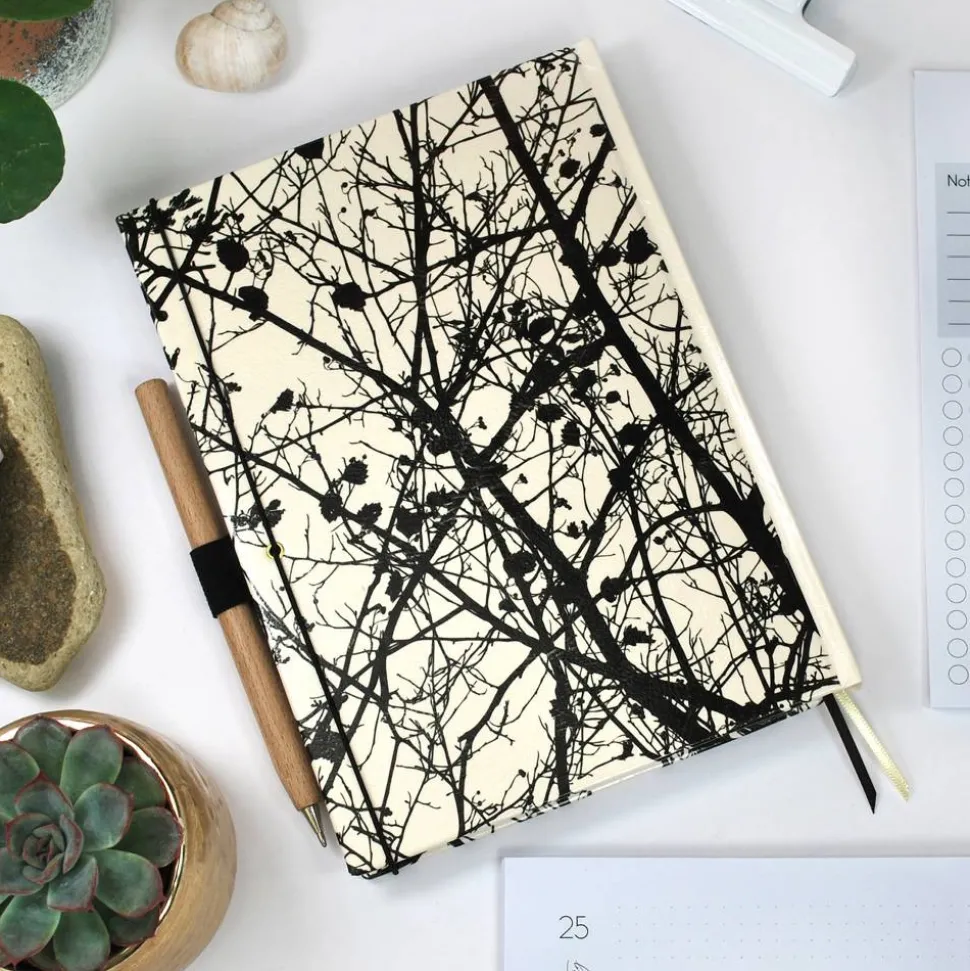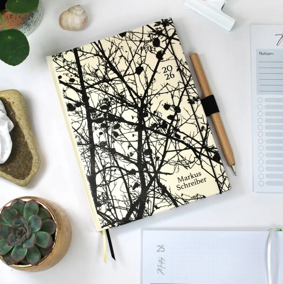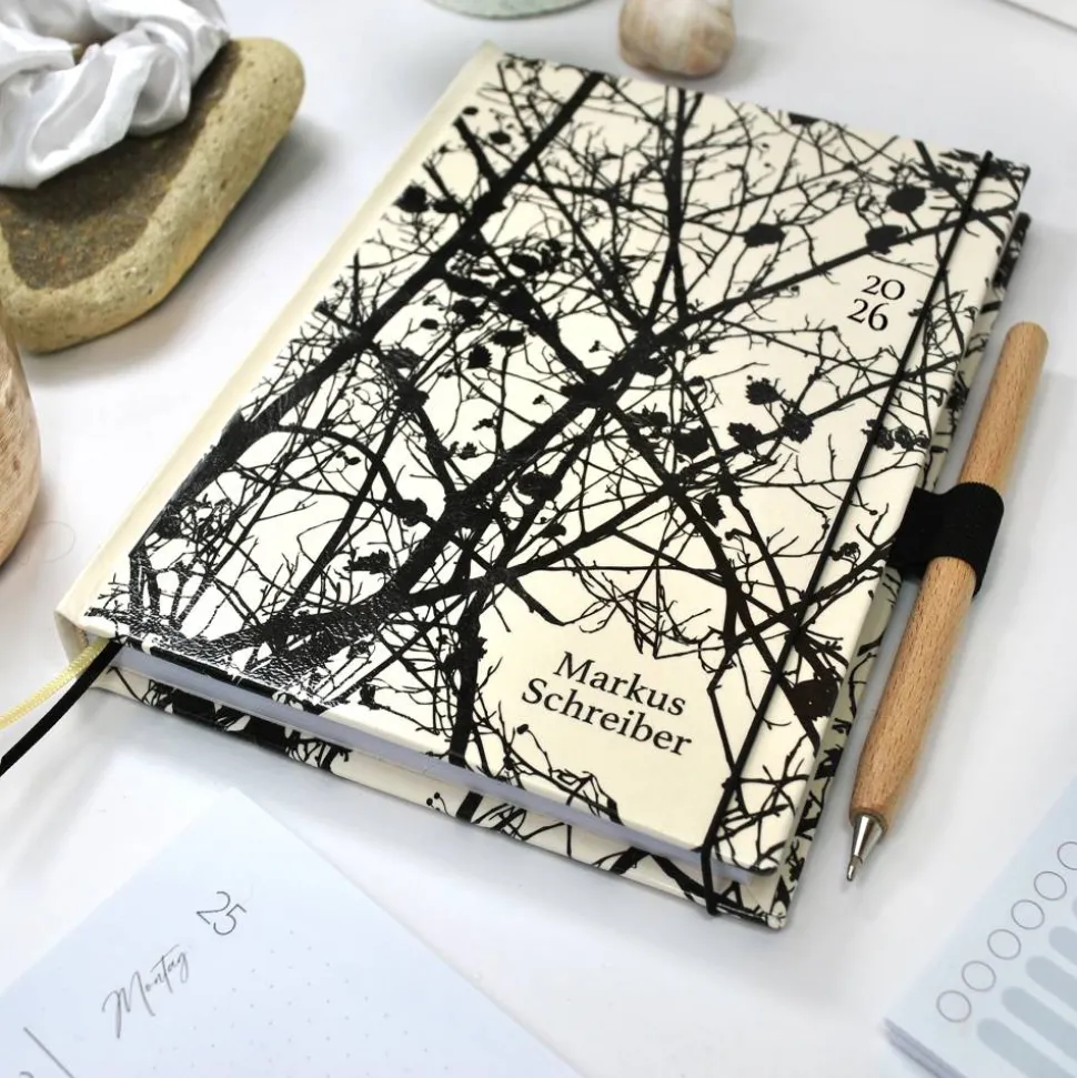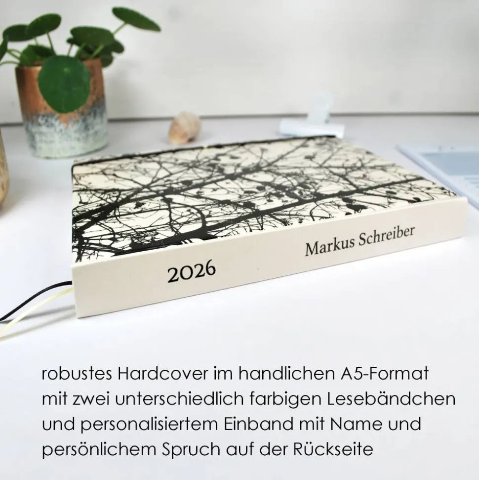 personalisierter Hardcover-Buchkalender A5 für das Kalenderjahr 2026 in Weiß mit feiner Silhouette aus Zweigen und Ästen sowie vielen praktischen Extras, wie integriertem Stifthalter, hölzernem Kugelschreiber, Tasche für Zettel, Lesebänder und Gummiband-Verschluss