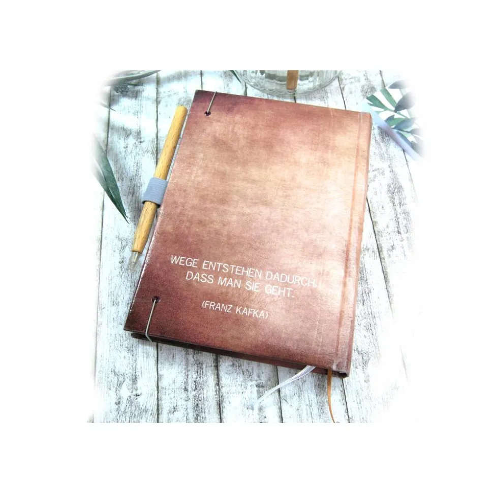 Robuster und durchdachter Jahres- und Tagesplaner in schicker, brauner Lederoptik personalisiert mit Name und frei wählbarem Spruch auf dem Buchcover wahlweise für 2024/25 oder das gesamte Kalenderjahr 2025