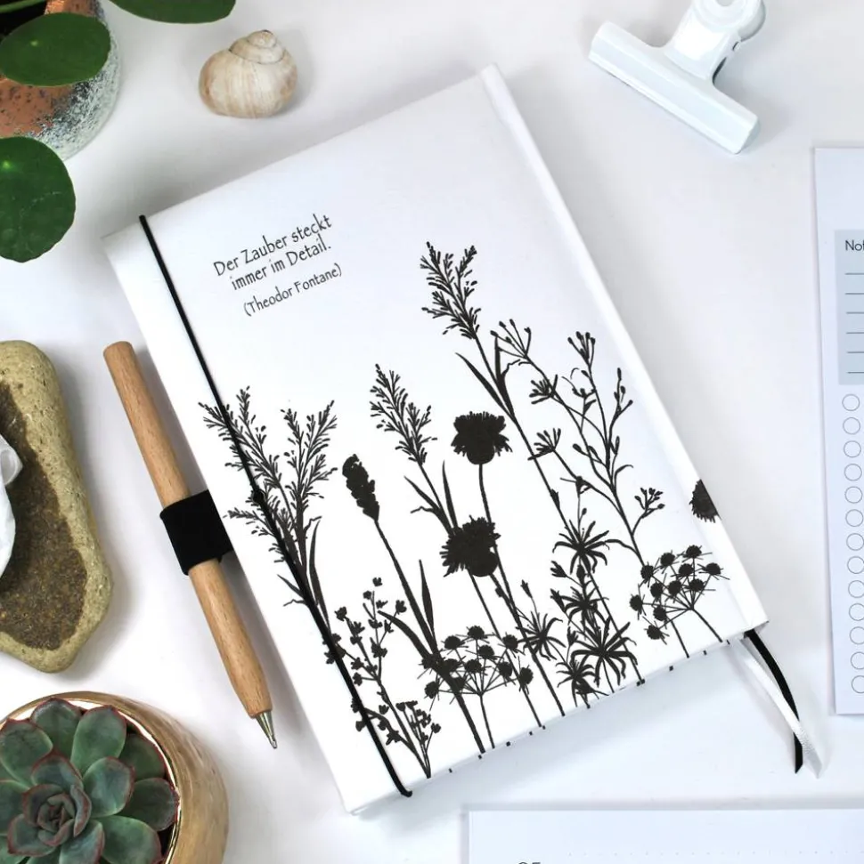 Robuster und durchdachter Jahres- und Tagesplaner mit der Silhouette zarter Wiesenblumen personalisiert mit Name und frei wählbarem Spruch auf dem Buchcover für das Kalenderjahr 2026