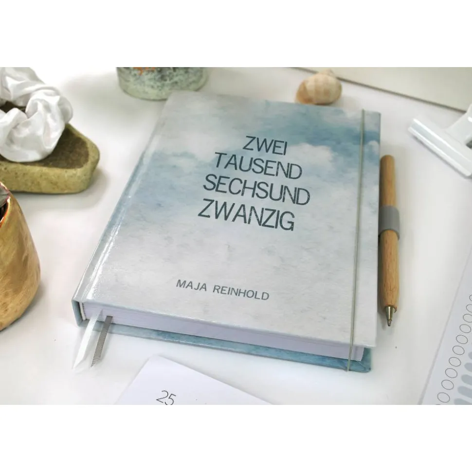 Robuster und durchdachter Jahres- und Tagesplaner mit feinem Struktureinband und blassblauem Wolkenhimmel; personalisiert mit Name und frei wählbarem Spruch auf dem Buchcover für das Kalenderjahr 2026.