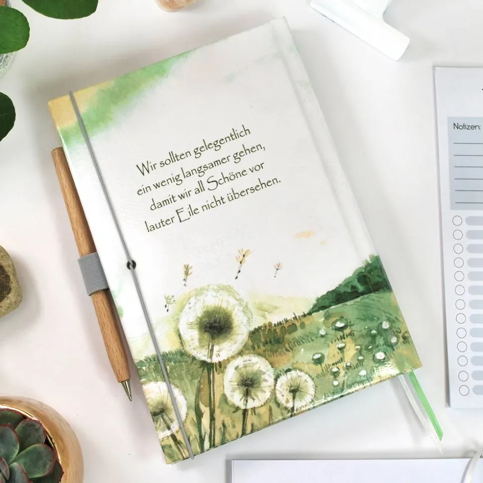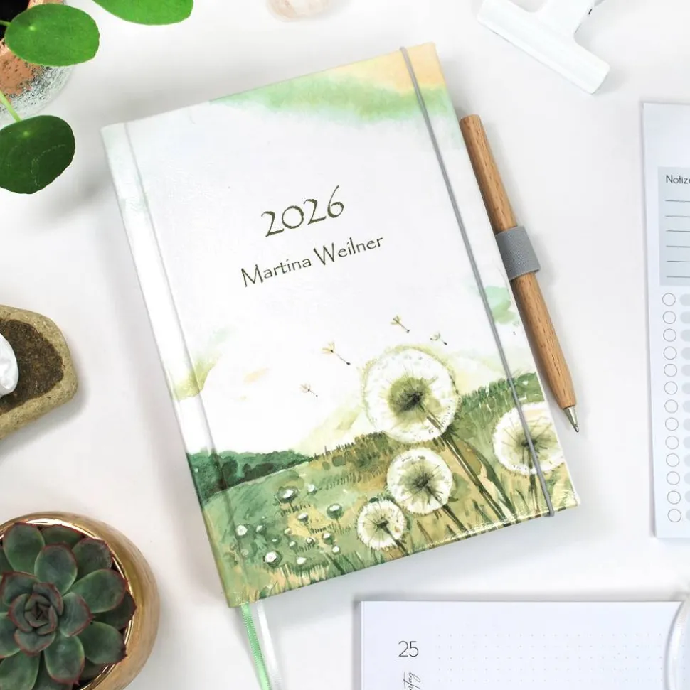 Personalisierter A5 Hardcover-Kalender 2026 – Pusteblume auf grüner Wiese Design in GrünDein stilvoller Begleiter fürs neue Jahr – individuell, hochwertig & durchdacht gestaltet.