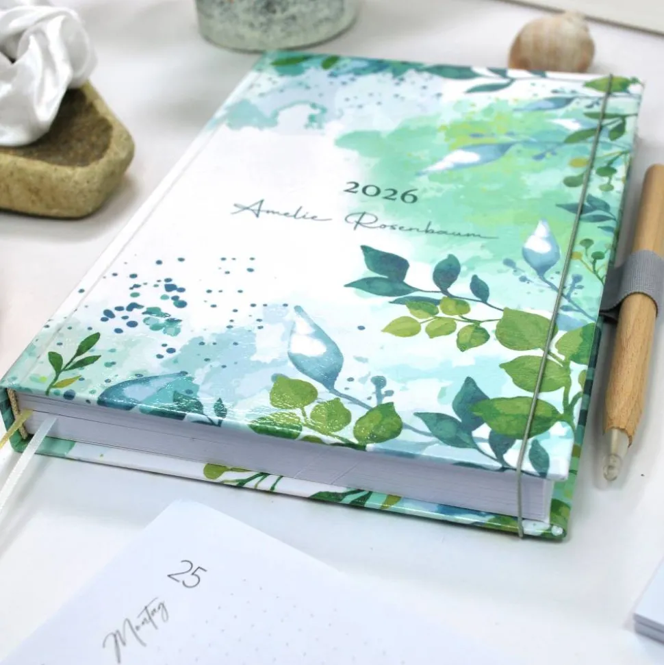 Wochenkalender & Terminplaner 2026 A5 mit vielen Extras personalisiert botanisch Pflanzen Blätter grün