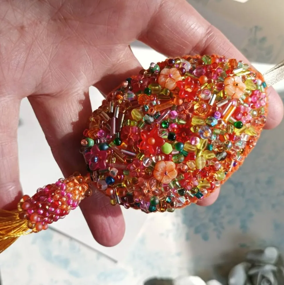 Opulentes Osterei mit heller Quaste und einer Höhe von etwa 8 Zentimeter und einer Breite von 6 cm.und durch die Füllung und die Perlenstickerei ist dieses Perlenei etwa 2 cm stark. Komplette Länge mit Satinband 20 cm, nur die Quaste etwa 7 cm.