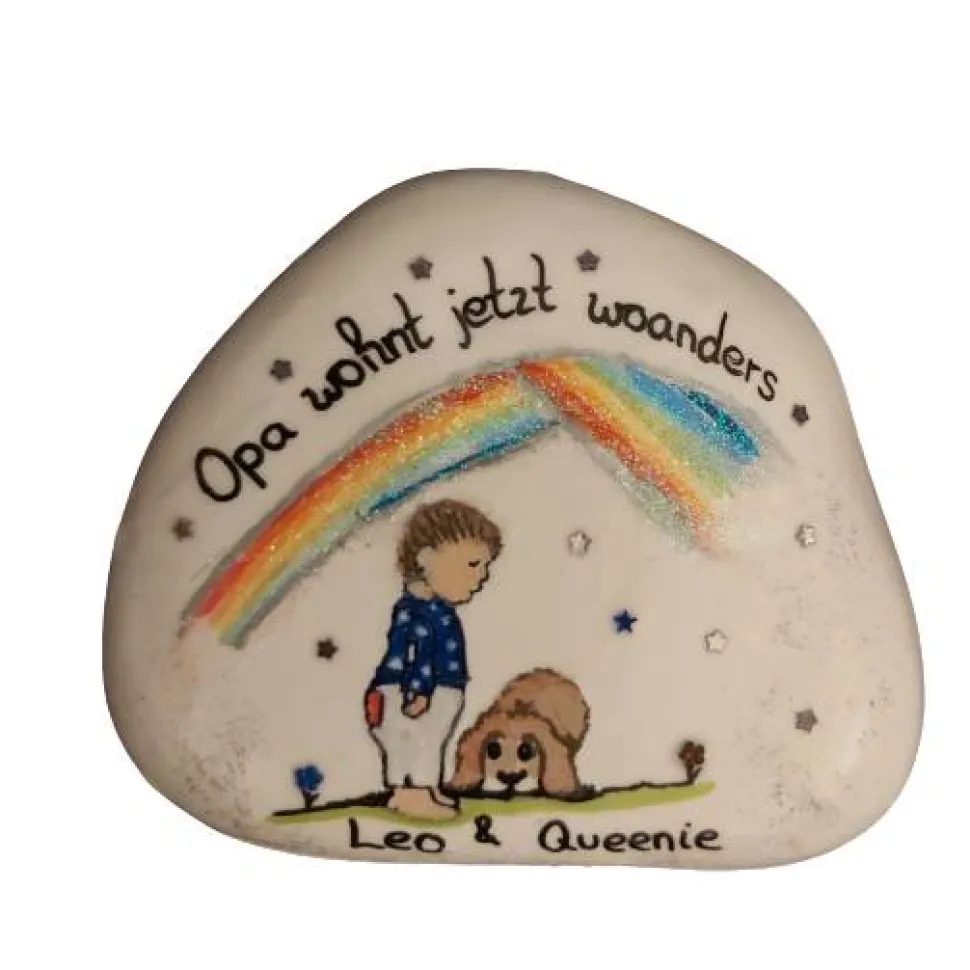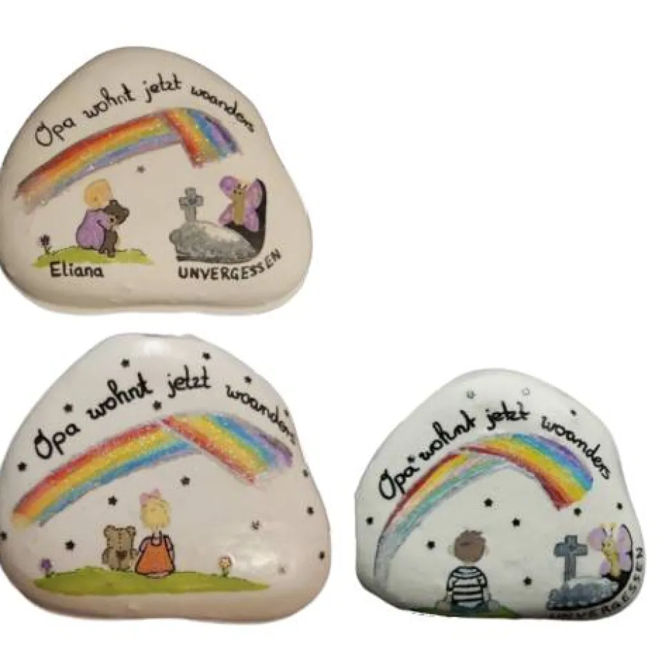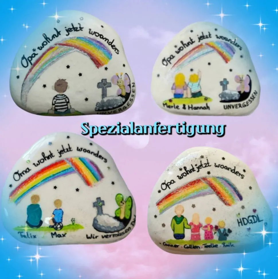 Dieser Trauerstein ist eine Spezialanfertigung und wird nur für Sie gemalt. Er trägt die Essenz Ihrer Erinnerungen, Liebe und Ihres Verlusts. Jeder Stein ist ein Symbol für die Einzigartigkeit eines Lebens, für Momente, die unvergessen bleiben. Sie sind Kunstwerke mit Herzblut und Hingabe, geschaffen, um die Schönheit des Lebens und die Liebe festzuhalten. Jeder Stein ist ein Unikat, das dazu bestimmt ist, zu berühren und zu verzaubern. ✨❤️