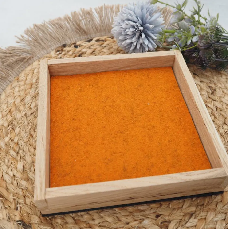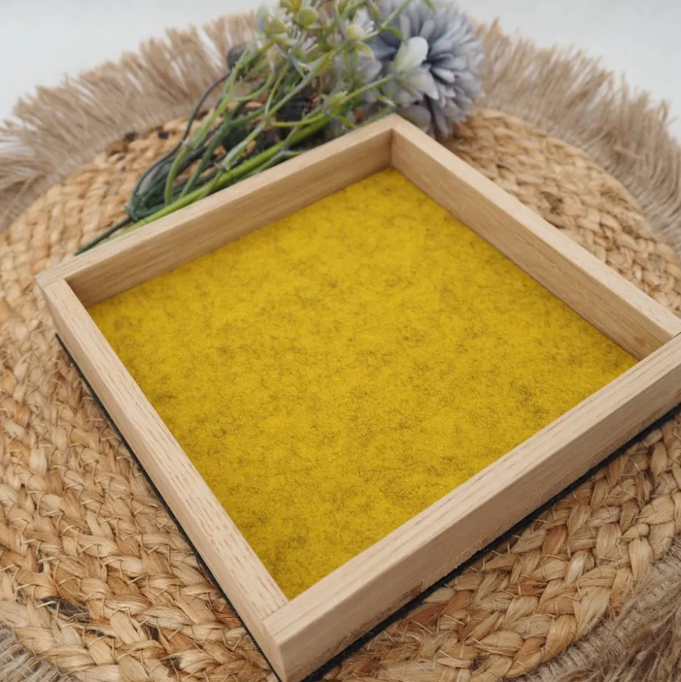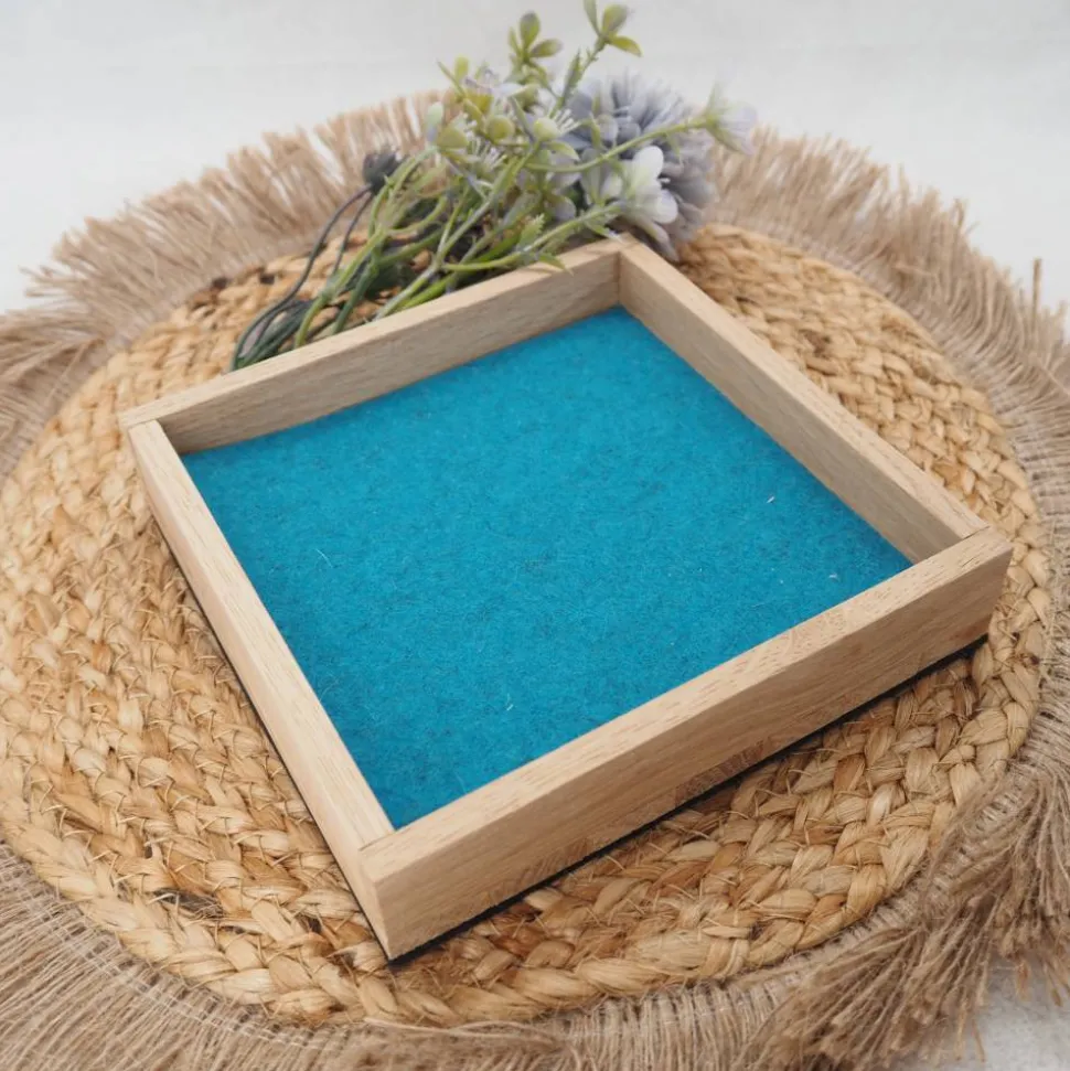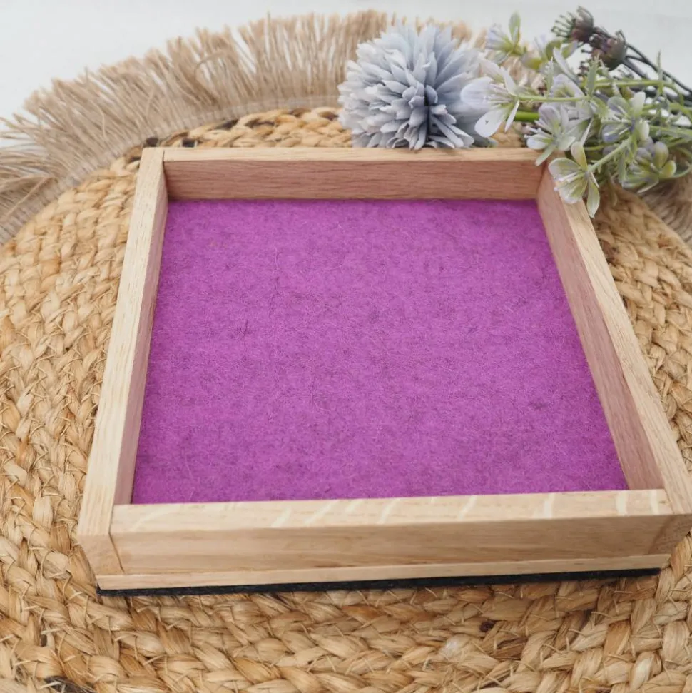 Wähle aus verschiedenen Filzfarben wie hellgrau, anthrazit, rot-meliert, grün-meliert, pink/magenta, blau, hellgelb, malve, senfgelb, türkis oder orange und kreiere Dein individuelles Würfelbrett. Standardmäßig erhältst Du das Brett mit grüner Filzauskleidung und anthrazitfarbenem Filz auf der Unterseite, falls keine Wunschfarbe gewählt wird.