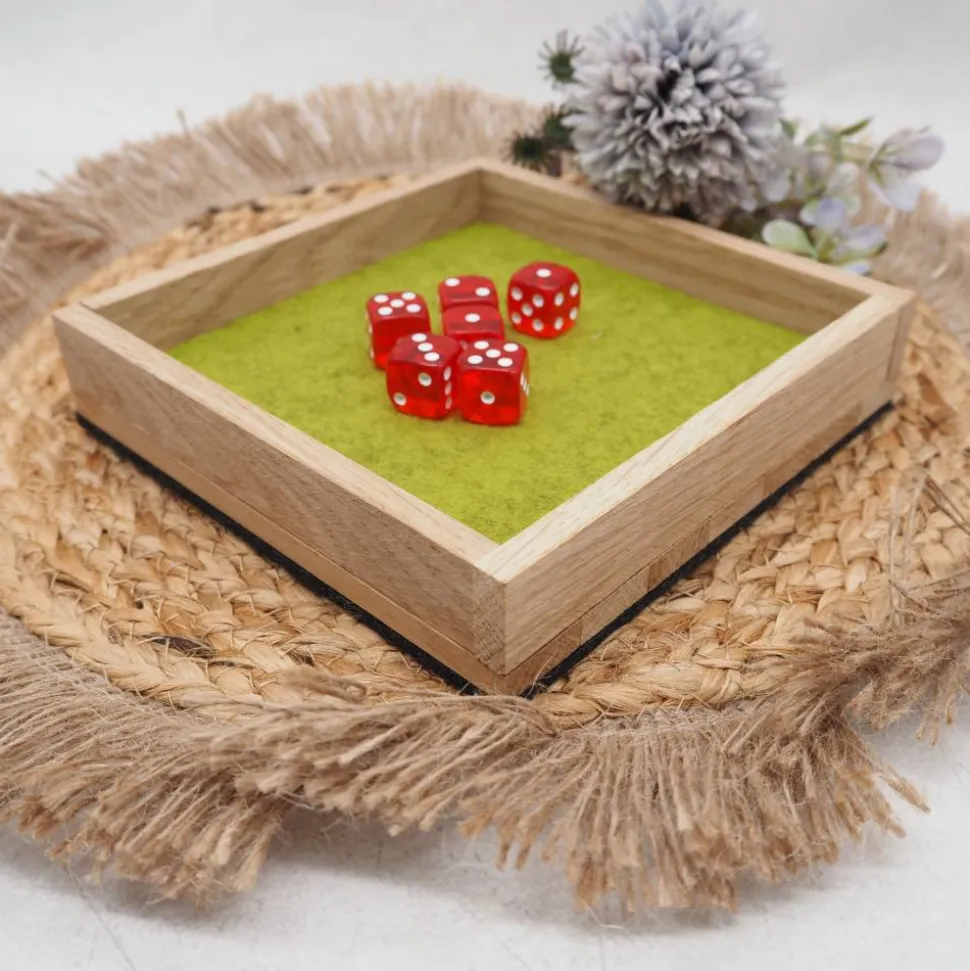 Schütze Deinen Tisch und genieße ungestörte Spieleabende mit dem hochwertigen Würfelbrett! Diese Würfelunterlage überzeugt durch eine elegante Holzumrandung aus Eiche und eine weiche Filzauskleidung. So schützt Du nicht nur Deine Möbel vor Kratzern, sondern minimierst auch die Würfelgeräusche. Die Würfel bleiben durch den Rand sicher auf dem Pad und kullern nicht mehr davon.