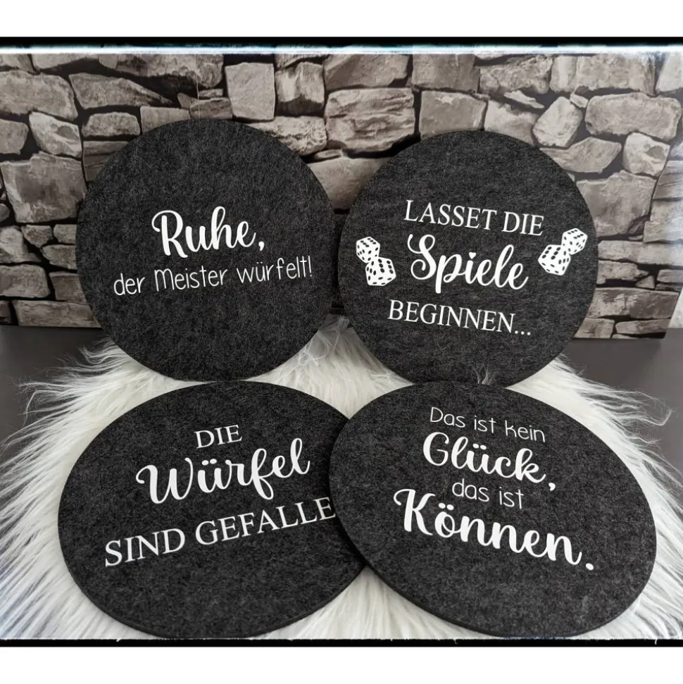 Die Unterlagen sind aus Filz und werden mit Flexfolie in weiß oder silber beplottet.