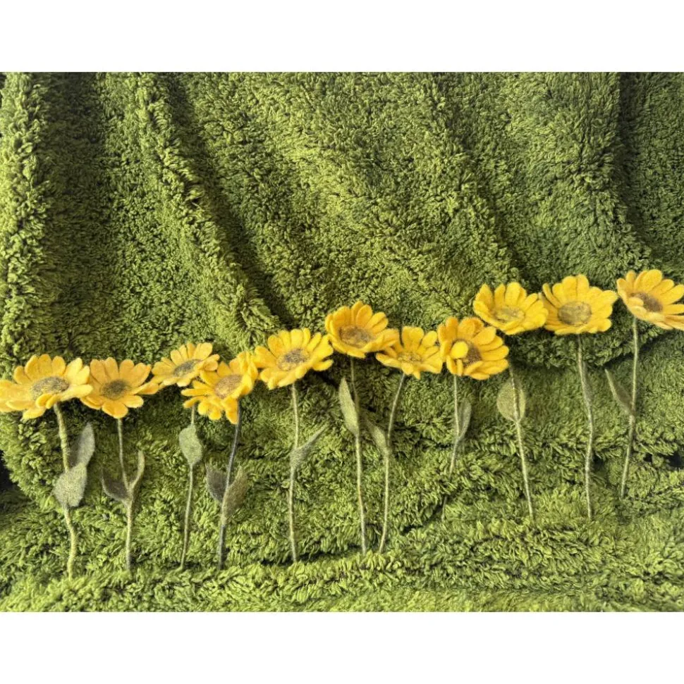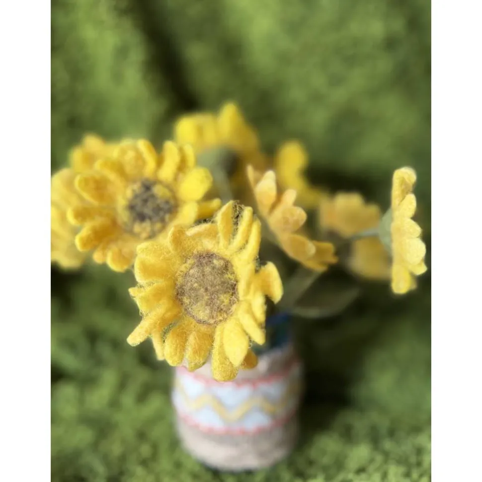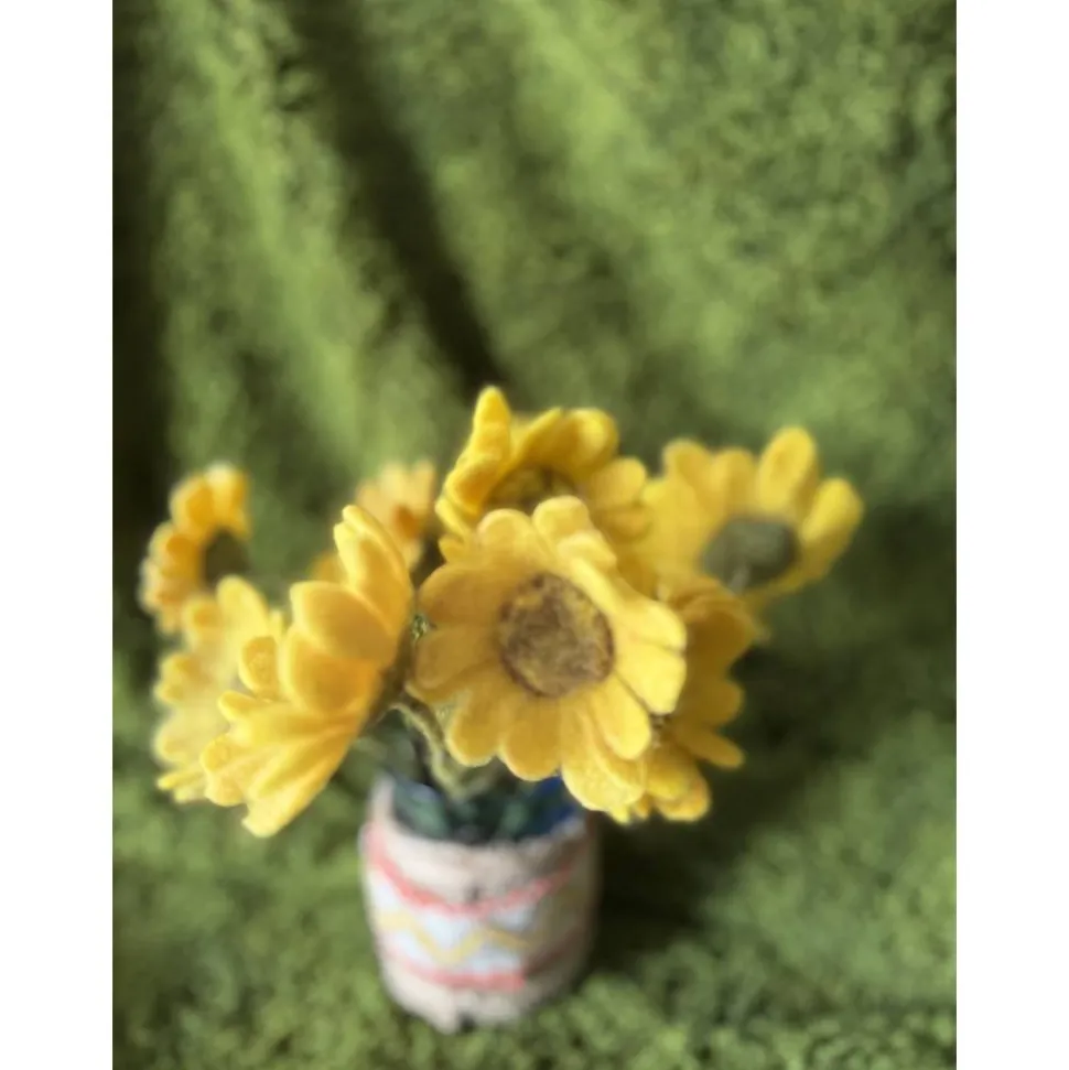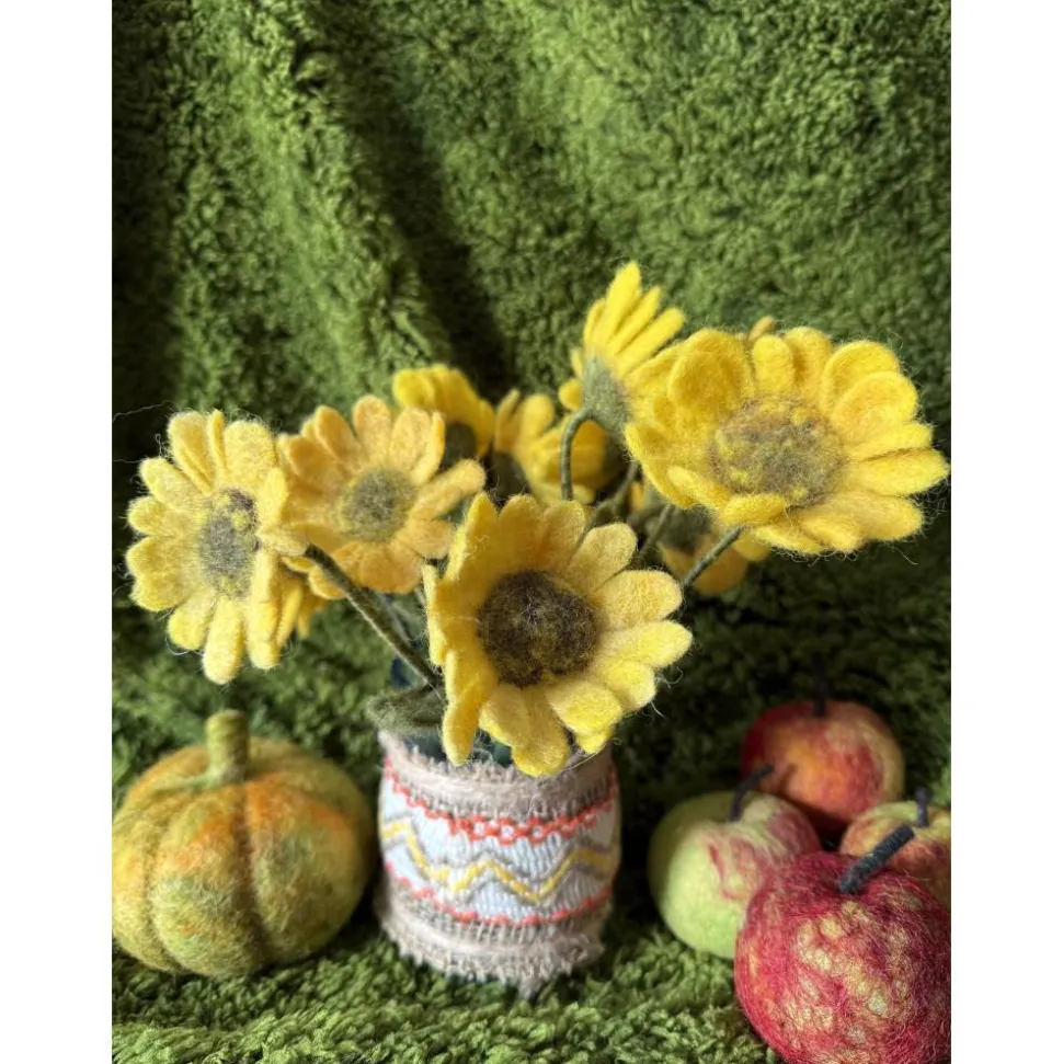 Jede Blume ist ein Unikat – sorgfältig gearbeitet mit viel Liebe zum Detail. Die warmen Gelbtöne und die weiche Haptik machen sie zu einem besonderen Blickfang, ob einzeln oder im Strauß arrangiert. Kombiniert mit kleinen Filzkürbissen entsteht ein herbstliches Ensemble, das lange Freude bereitet.