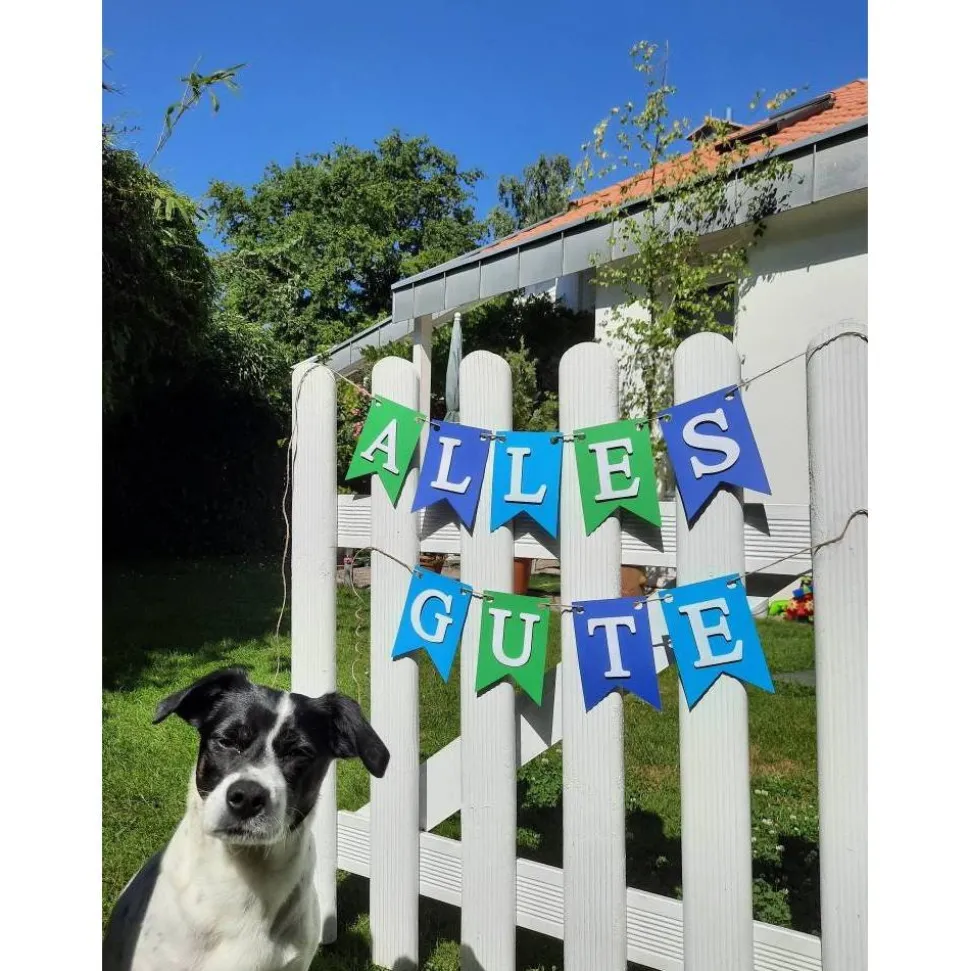 Unsere „Alles Gute “ Girlande gibt es jetzt auch in Blau und Grün mit weißer Schrift.