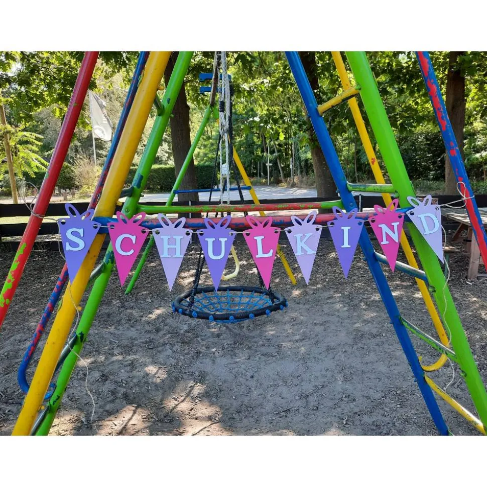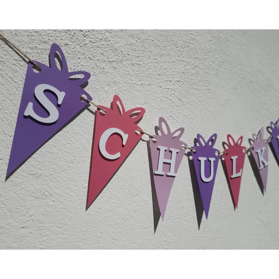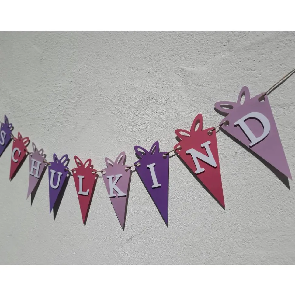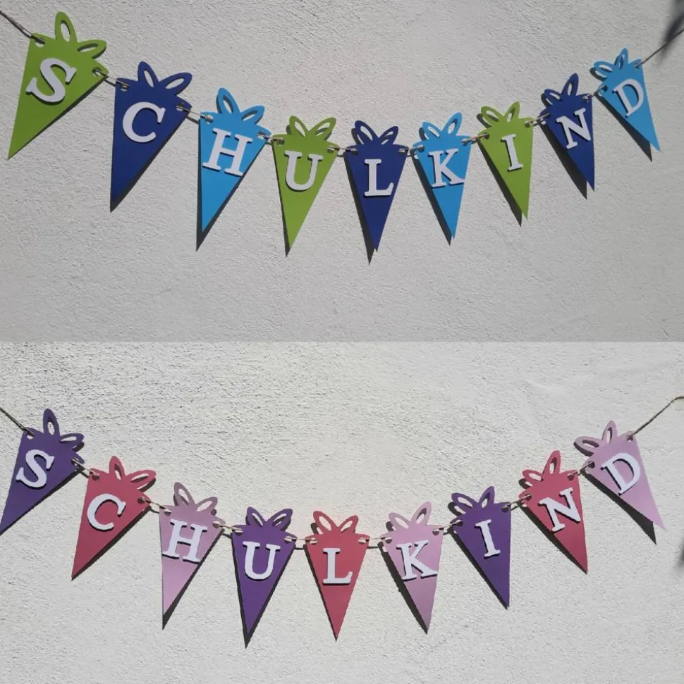 Mit unserer super niedlichen Girlande mit kleinen Schultüten und der Aufschrift „Schulkind“ kommt die richtige Deko für diesen wichtigen Tag.