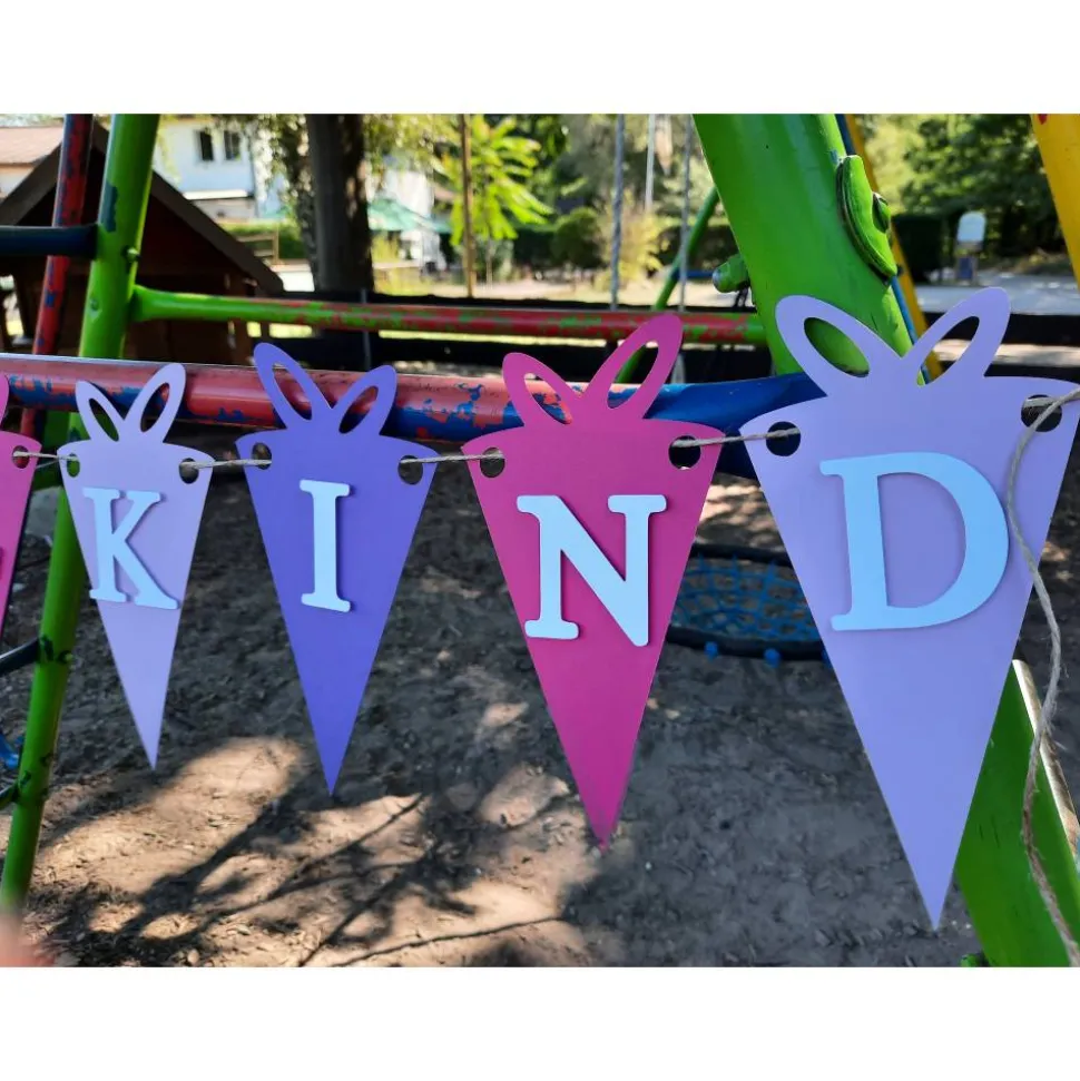 Die Wimpelkette ist in Lila, Flieder und pink mit weißer aufgesetzter Schrift.