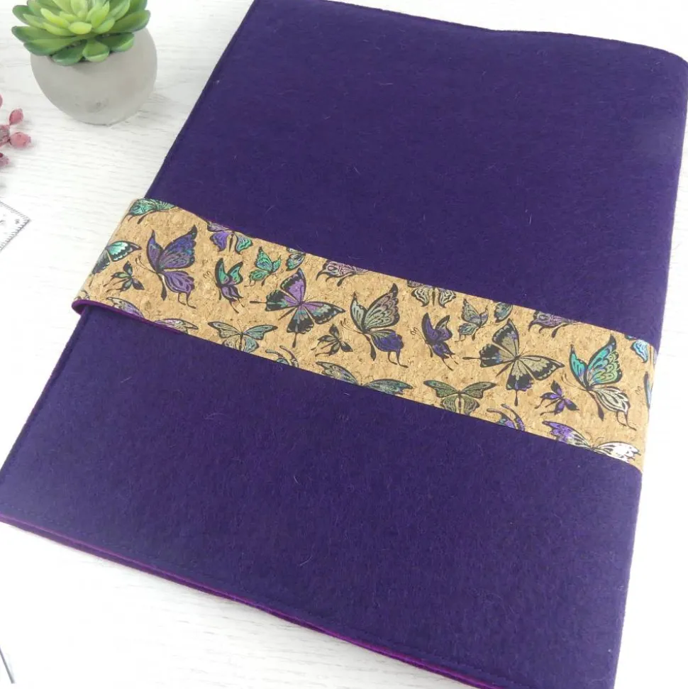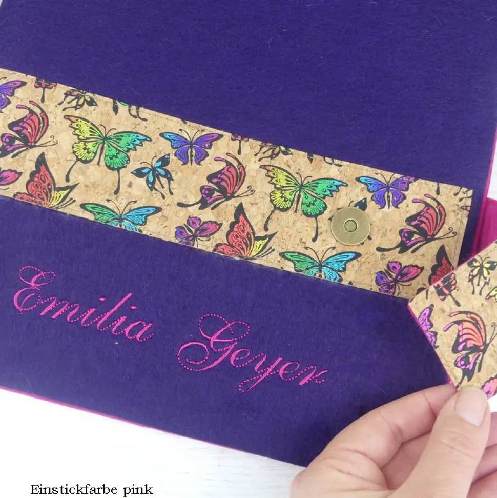 Das besondere Highlight: Ein eleganter Korkstreifen mit glitzernden Schmetterlingen oder Blümchen umschließt die Mappe und sorgt mit einem hochwertigen Magnetknopf für einen sicheren Verschluss.