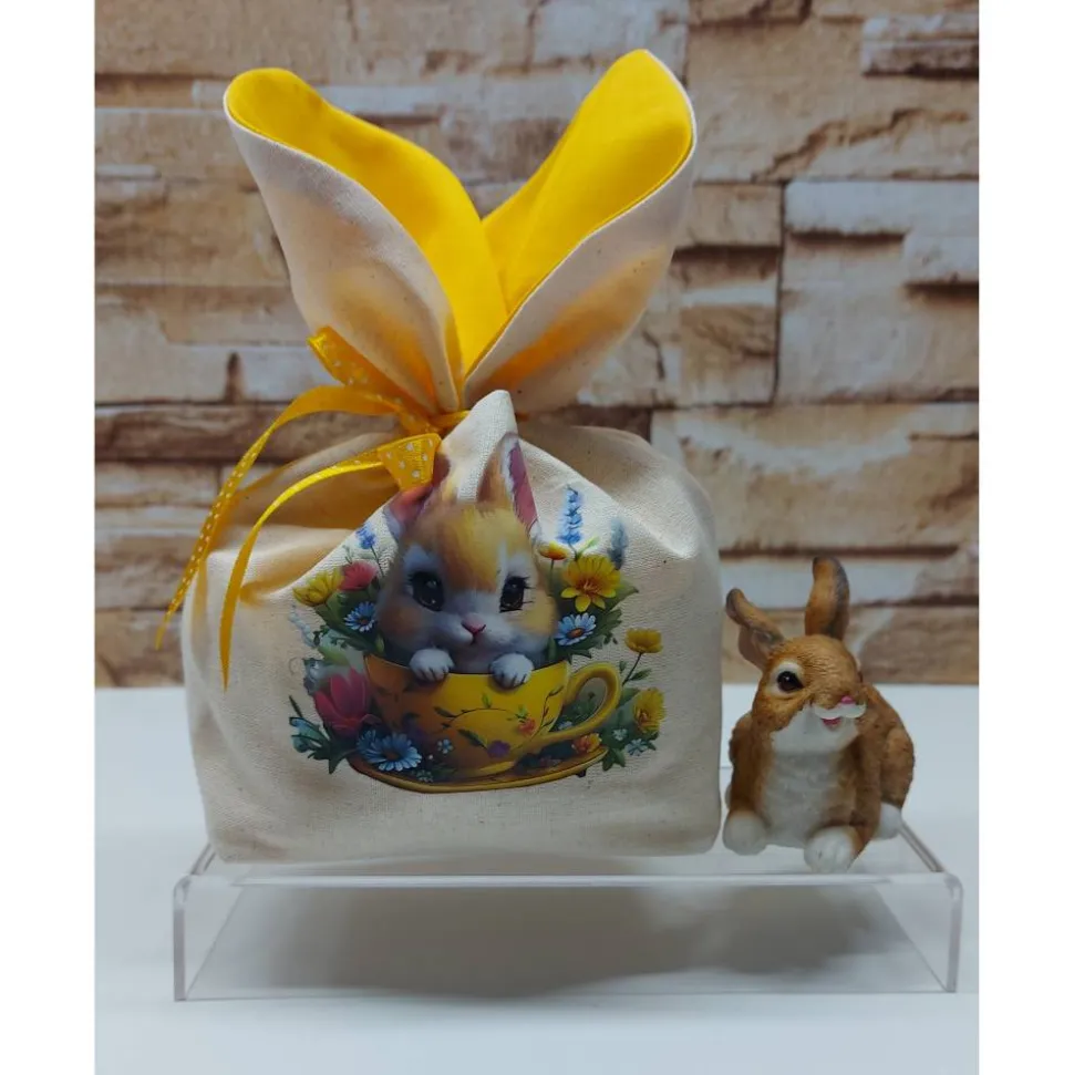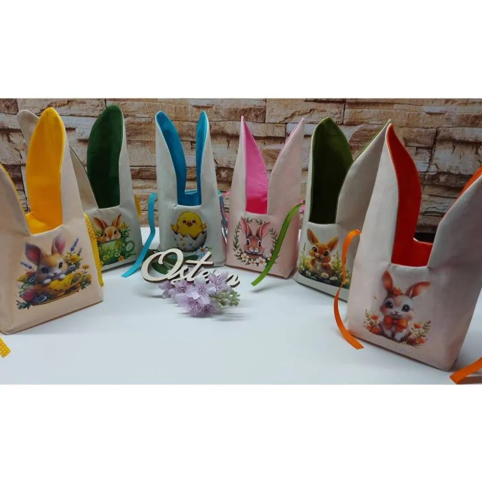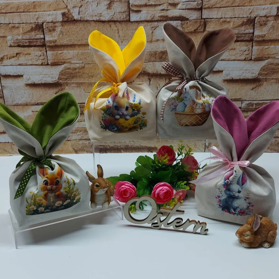 Die Ostersäckchen bestehen aus reinen Baumwollstoffen und sind auf der Vorderseite mit einem hübschen Osterbügelbild versehen.