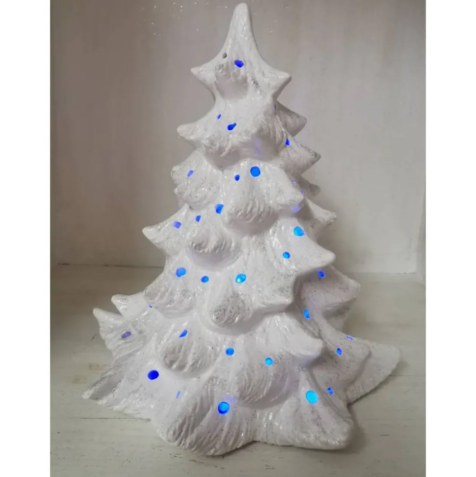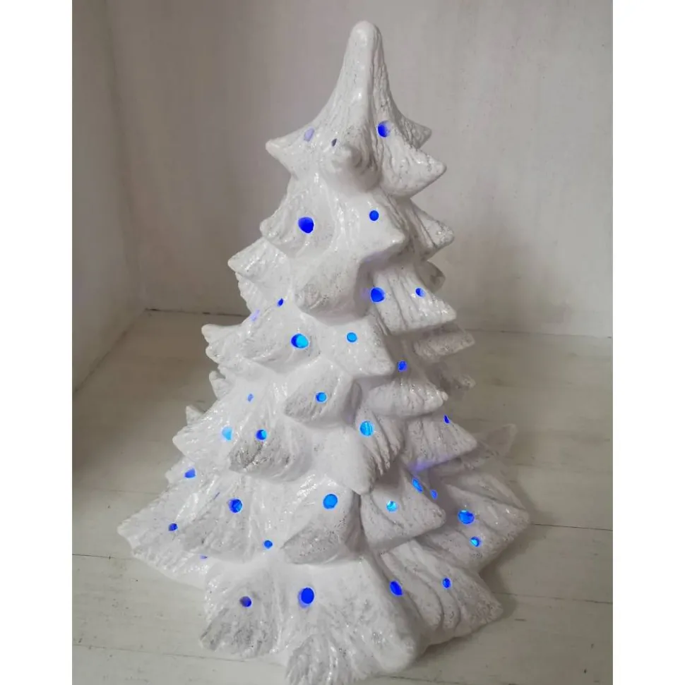 Der Baum ist aus Keramik und ca 30cm hoch. Liebevoll grundiert und geweisst ist er zeitlos schön. Ich hab ihn noch mit Glitzer versehen und zweimal wetterfest versiegelt. Er kann draussen stehen, sollte aber vor Frost geschützt werden. Die Figur ist ausgeschnitten und kann beleuchtet werden, ich empfehle LED Kerze oder Lichterkette zu verwenden.