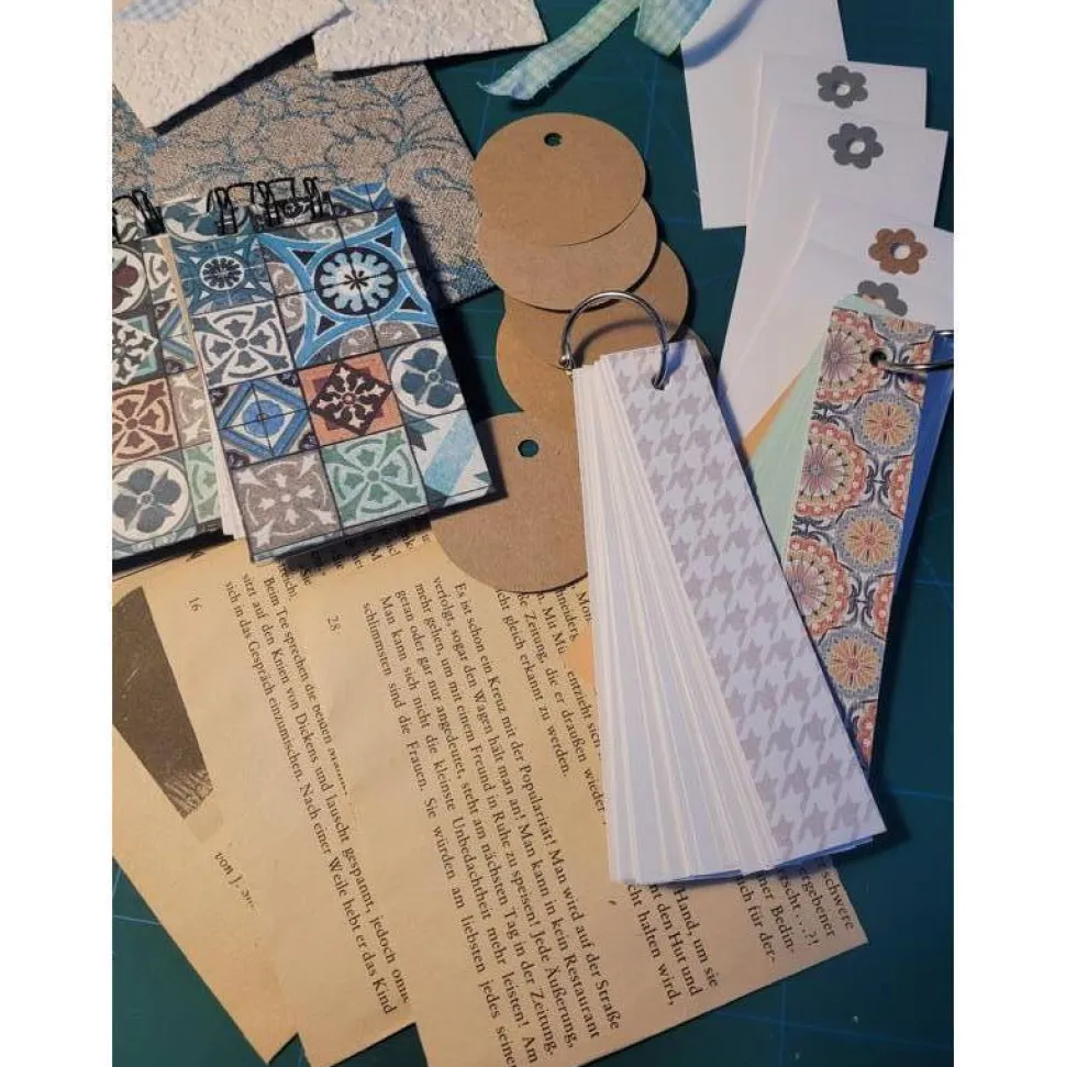 gefüllt mit je 2 Miniblöcken und einem Mini – Vokabelblock mit Ring, Tags ( immer mit einem Bändchen zum Anhängen versehen ), Mini – Umschlägen, Tütchen … Stückchen Geschenkband …