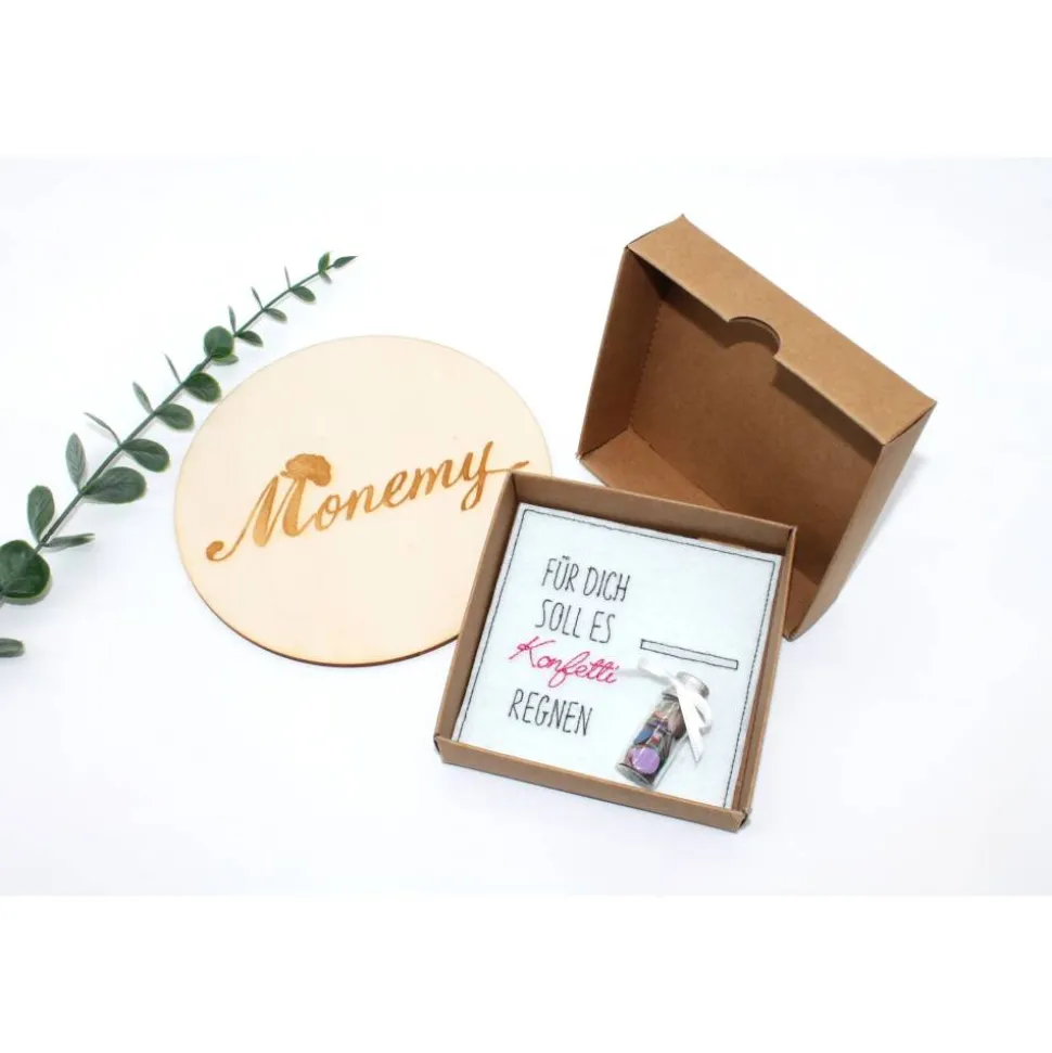 Ein echter Blickfang ist der liebevoll eingestickte Spruch „Für dich soll es Konfetti regnen“, der für Freude und gute Laune sorgt. Das beiliegende Mini-Fläschchen ist mit buntem Konfetti gefüllt – eine kleine Überraschung mit großer Wirkung.