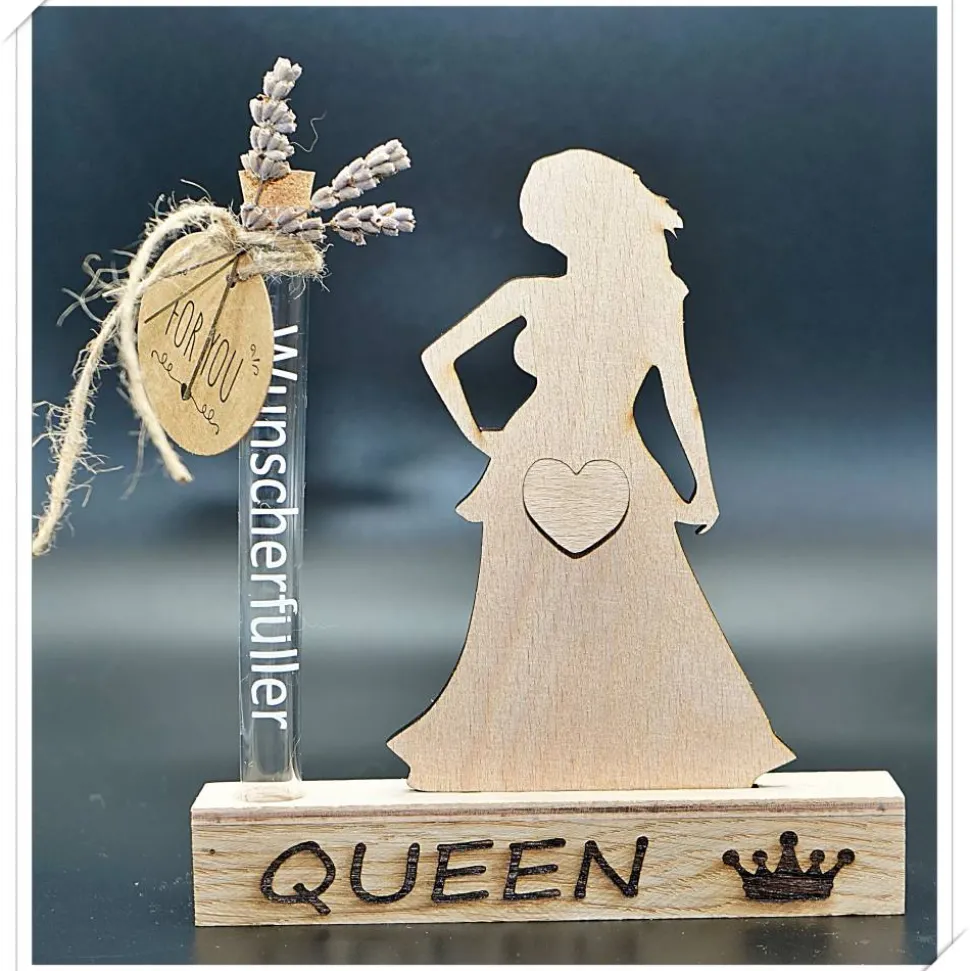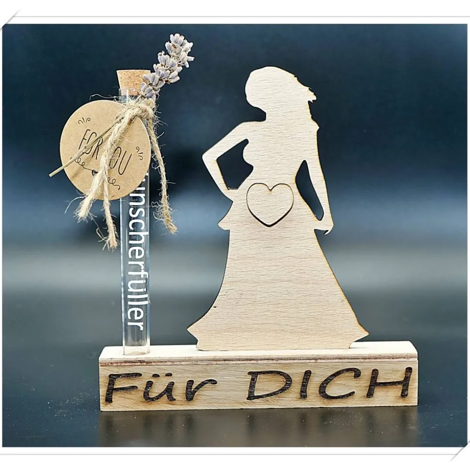Unsere Wunscherfüller sind mehr als nur dekorative Elemente – sie sind ein Symbol für Träume, Wünsche und die Schönheit von handgearbeitetem Eichenholz. Jeder Wunscherfüller verfügt über ein edles Reagenzglas, das perfekt für Ihre Geldgeschenke oder liebevollen Botschaften geeignet ist. Verleihen Sie Ihrem Geschenk eine persönliche Note, indem Sie zwischen einer schlichten Ausführung oder einer individuellen Gravur wählen. Wie wäre es zum Beispiel mit den liebevollen Worten „Für dich“, „Prinzessin“ oder „Queen“?