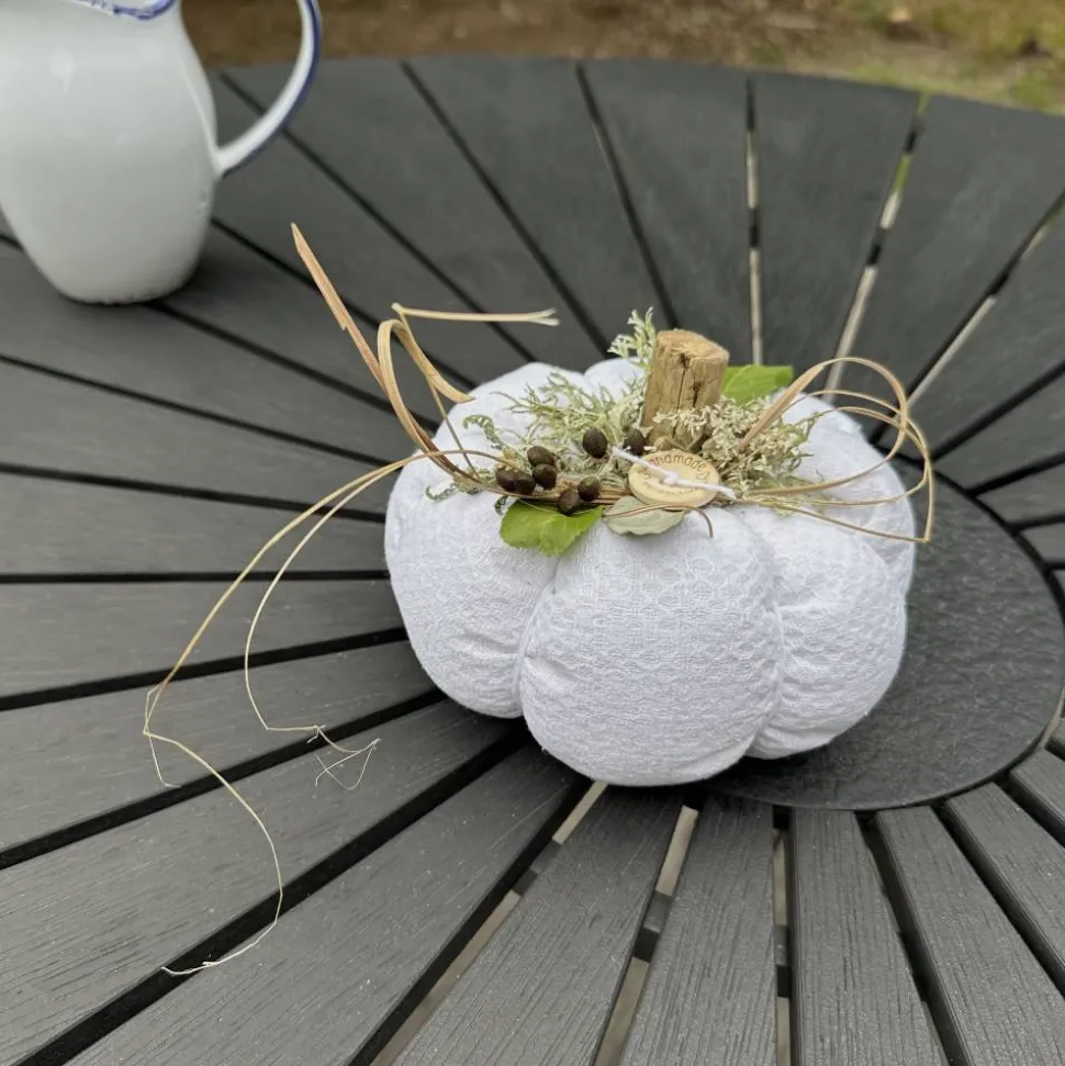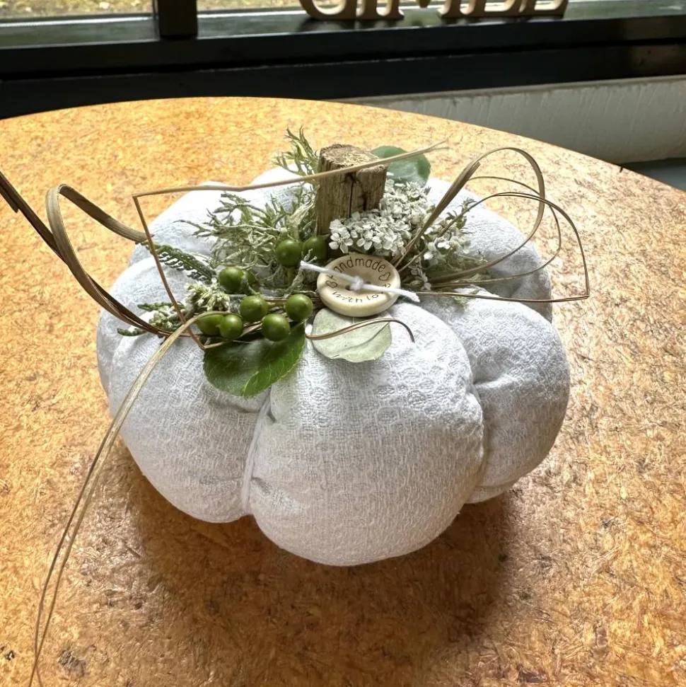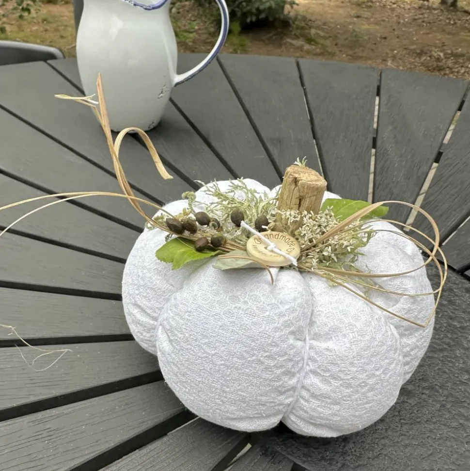 Entdecke einen zauberhaften Deko Kürbis in XL, handgefertigt aus antikem, handgewebtem Leinenstoff aus den 60er Jahren. Dieses einzigartige Unikat verbindet skandinavische Naturfundstücke von Fjordwanderungen mit liebevoll ausgewählten Naturakzenten – darunter luftgetrocknete Stauben Blüten, Seegras, Eukalyptus Blätter, Moor Birken Moos sowie seltene Wurzeln aus Treibholz.