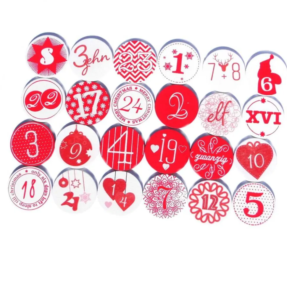 Die Holzscheiben haben einen Durchmesser von ca. 25 mm. Sie sind in klassischem rot weiß gestaltet. Verschiedene Motive für die individuelle Gestaltung Deines Adventskalenders.