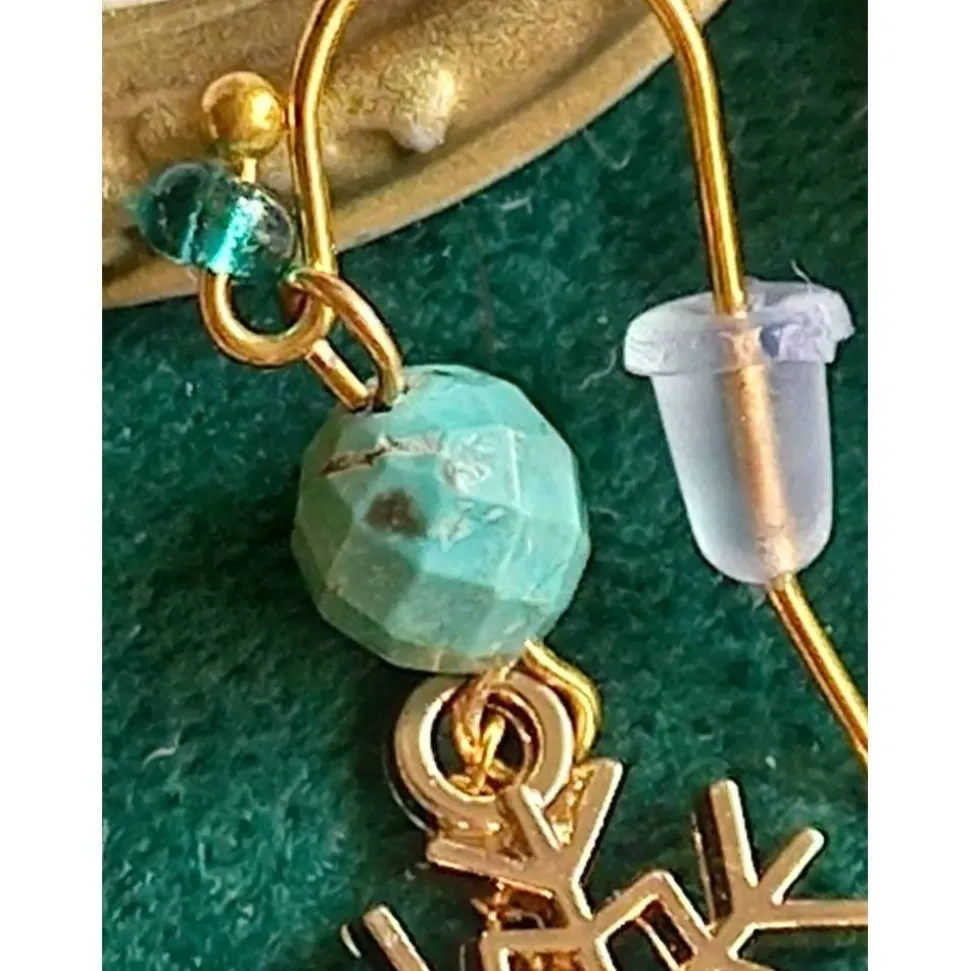2 gold-farbenen Schneeflocken-Anhängern (ca. 16 x 13 x 3 mm) aus Aluminium mit jeweils einem kleinen klaren Strass-Stein in der Mitte,
