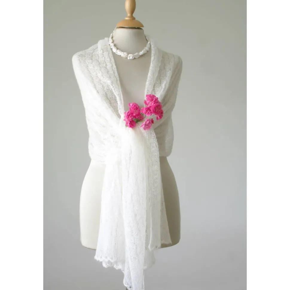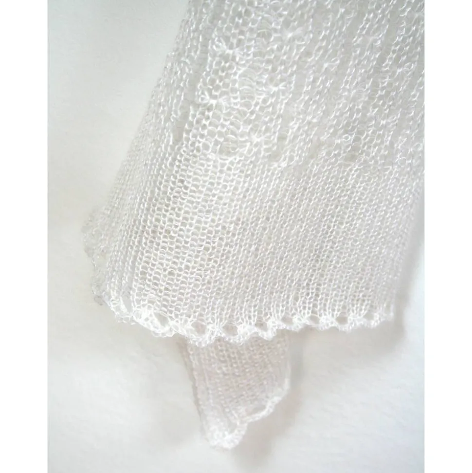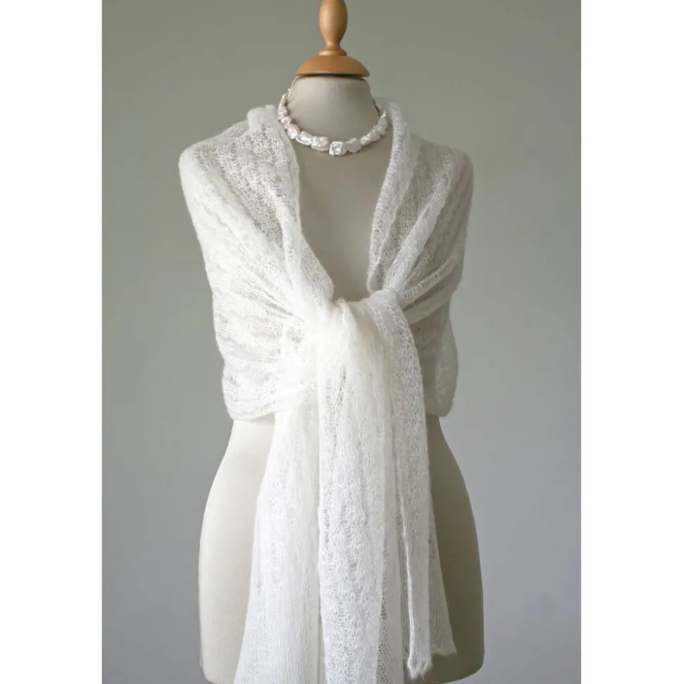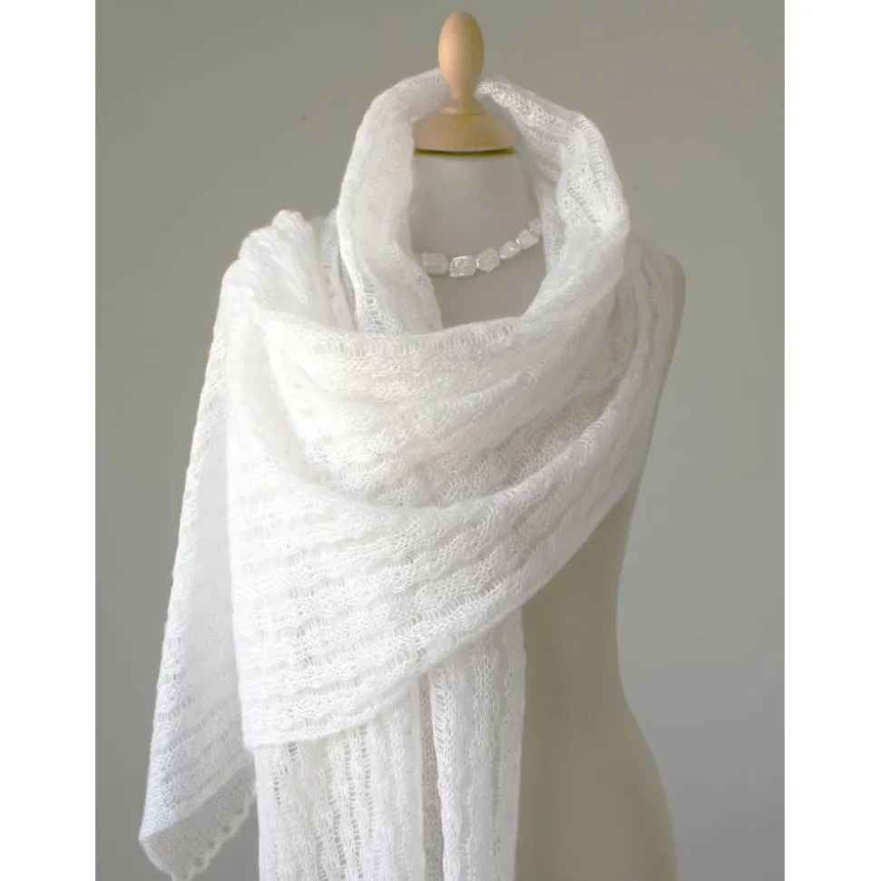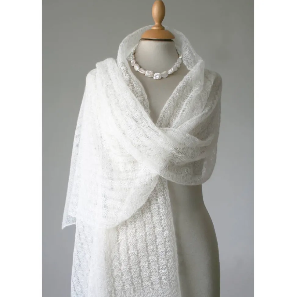 Das zarte Tuch ist aus einem dünnen italienischen Mohair-Garn gestrickt. Das dezente Muster ist zeitlos und elegant. An beiden Endkanten sind bogenförmige Bordüren gearbeitet.