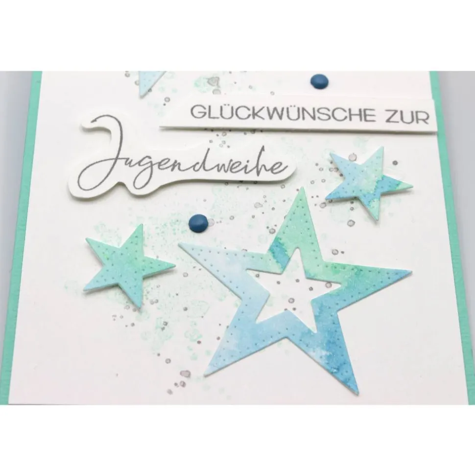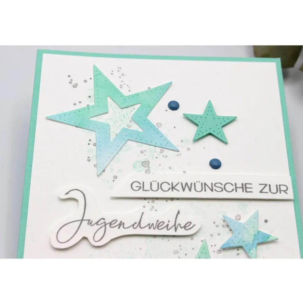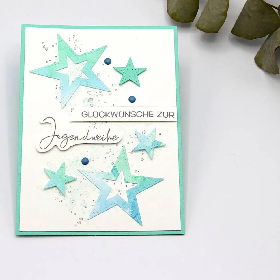 Sterne, die über die Karte verteilt sind, symbolisieren den Beginn eines neuen Lebensabschnitts und den Glanz der Jugendweihe.