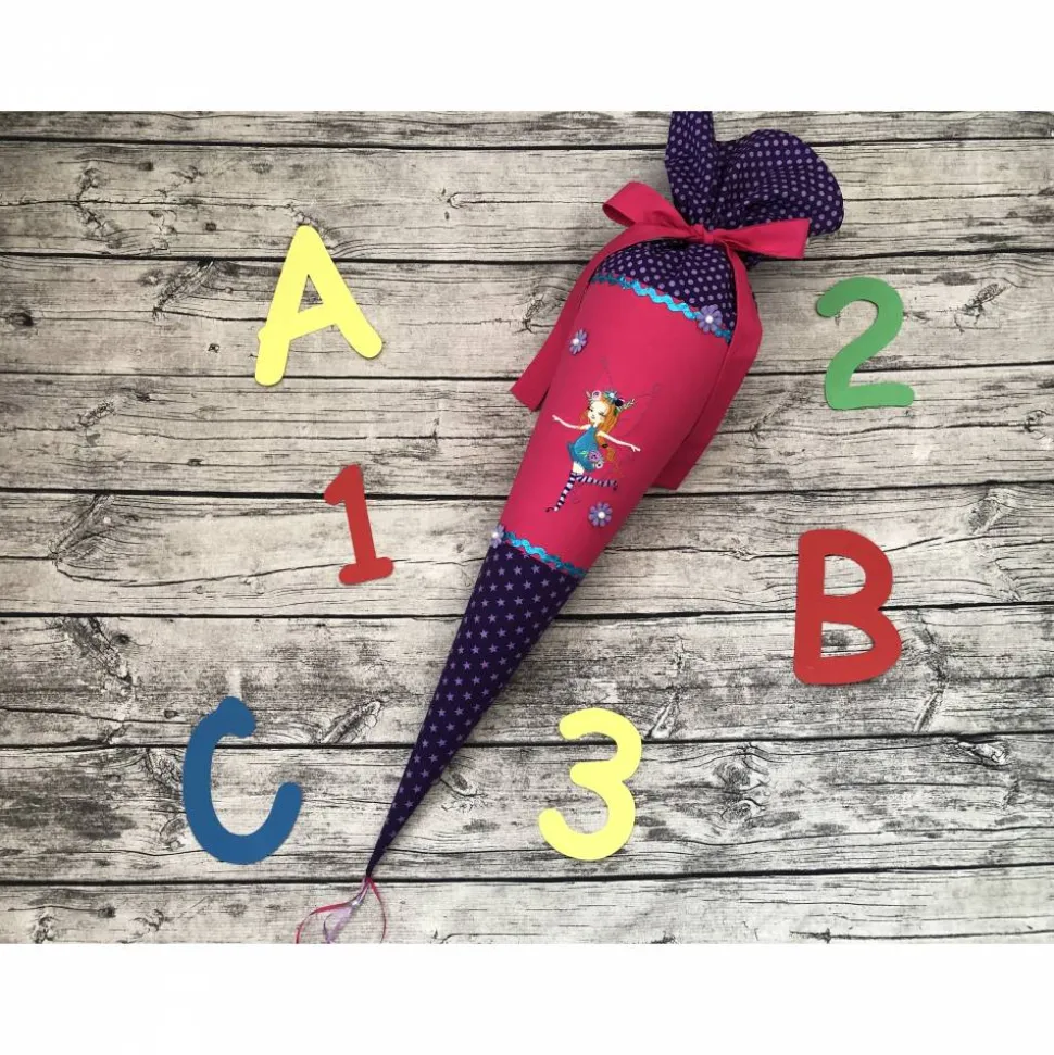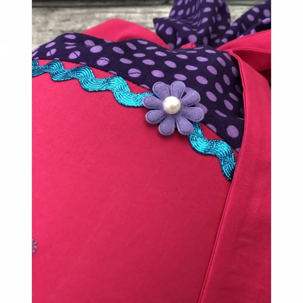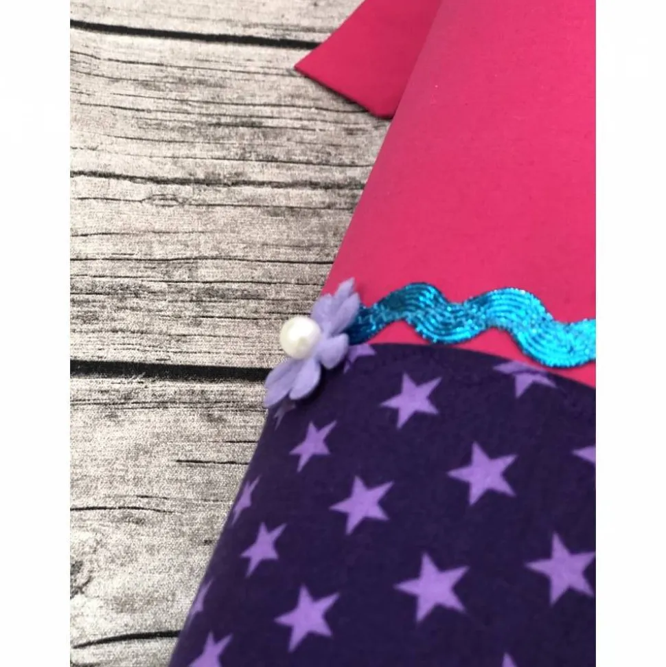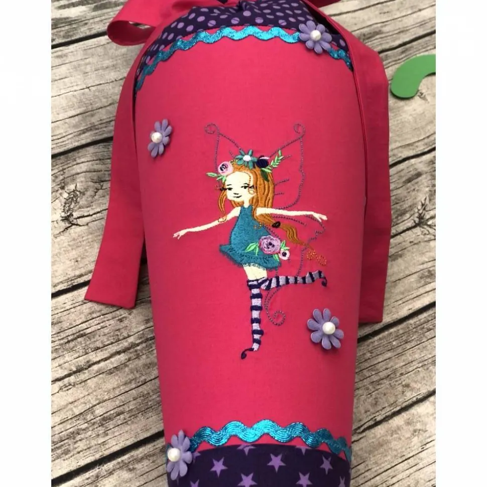 Hier habe ich eine ganz besondere in Pink und Lila für euch. Genäht aus schönen Baumwollstoffen, und bestickt mit einem wunderschönen Feen-Motiv von Marilena, und vielen kleinen Details wie Perlen auf den Blumen und kleinen Bänder und perlen an der Spitze.