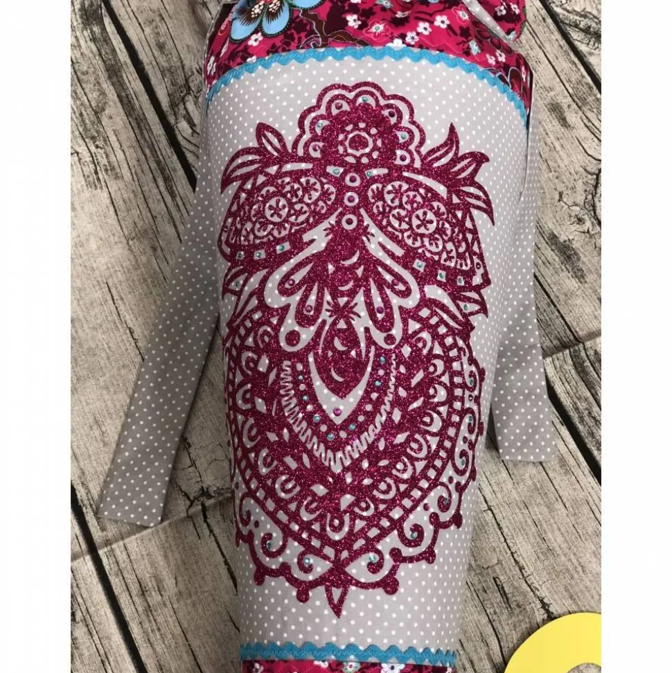 Hier habe ich eine ganz besondere für euch. Genäht aus schönen Baumwollstoffen in Pink & graun, und verziert mit einem wunderschönen Glitzer-Motiv von fusselfreies, und vielen kleinen Glitzersteinchen und Details in Türkis.