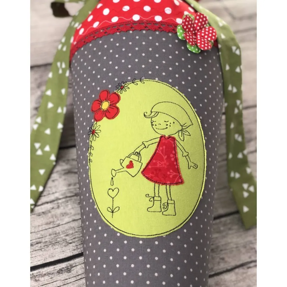 Hier habe ich eine besondere für euch. Genäht aus zauberhaften Baumwollstoffen in Rot-grau, bestickt mit einem wunderschönen Stickmotiv von KunterbuntDesign. Und verziert mit 3D Blümchen an der oberen Borde.