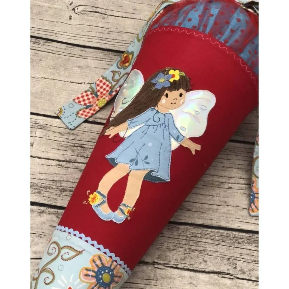 Hier habe ich eine ganz besondere für euch. Genäht aus einem zauberhaften Baumwollstoff-Schatz von Farbenmix mit Blumen in Kombi mit Rot und Türkis mit Herzen. Bestickt mit einem wunderschönen Stickmotiv „Fee“ von Stickherz. Zusätzlich verziert mit Tüll am Verschluss und Zierbändern .