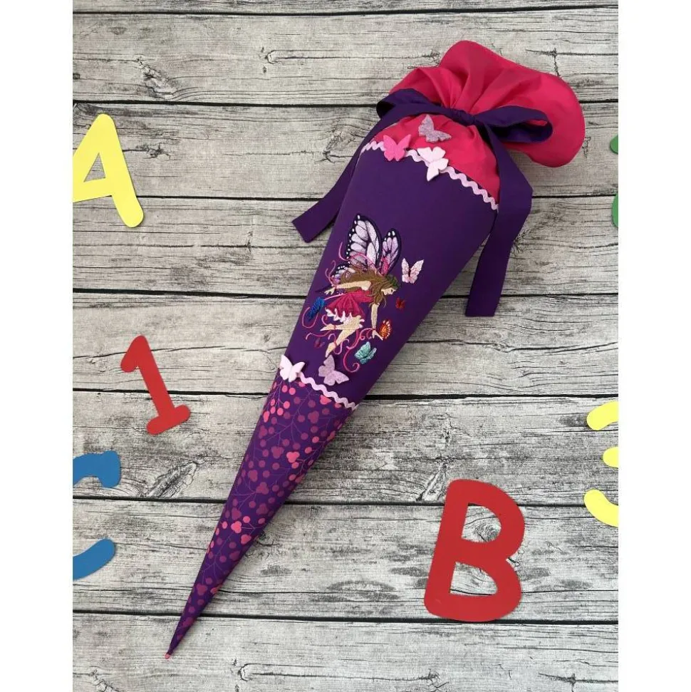Hier habe ich eine ganz besondere für euch. Genäht aus zauberhaftem Baumwoll-Stoffen in Lila & Pink und bestickt mit einem wunderschönen besonders aufwendigem Stickmotiv „Schmetterlingsfee“. Zusätzlich verziert mit kleinen 3D Filz-Schmetterlingen.