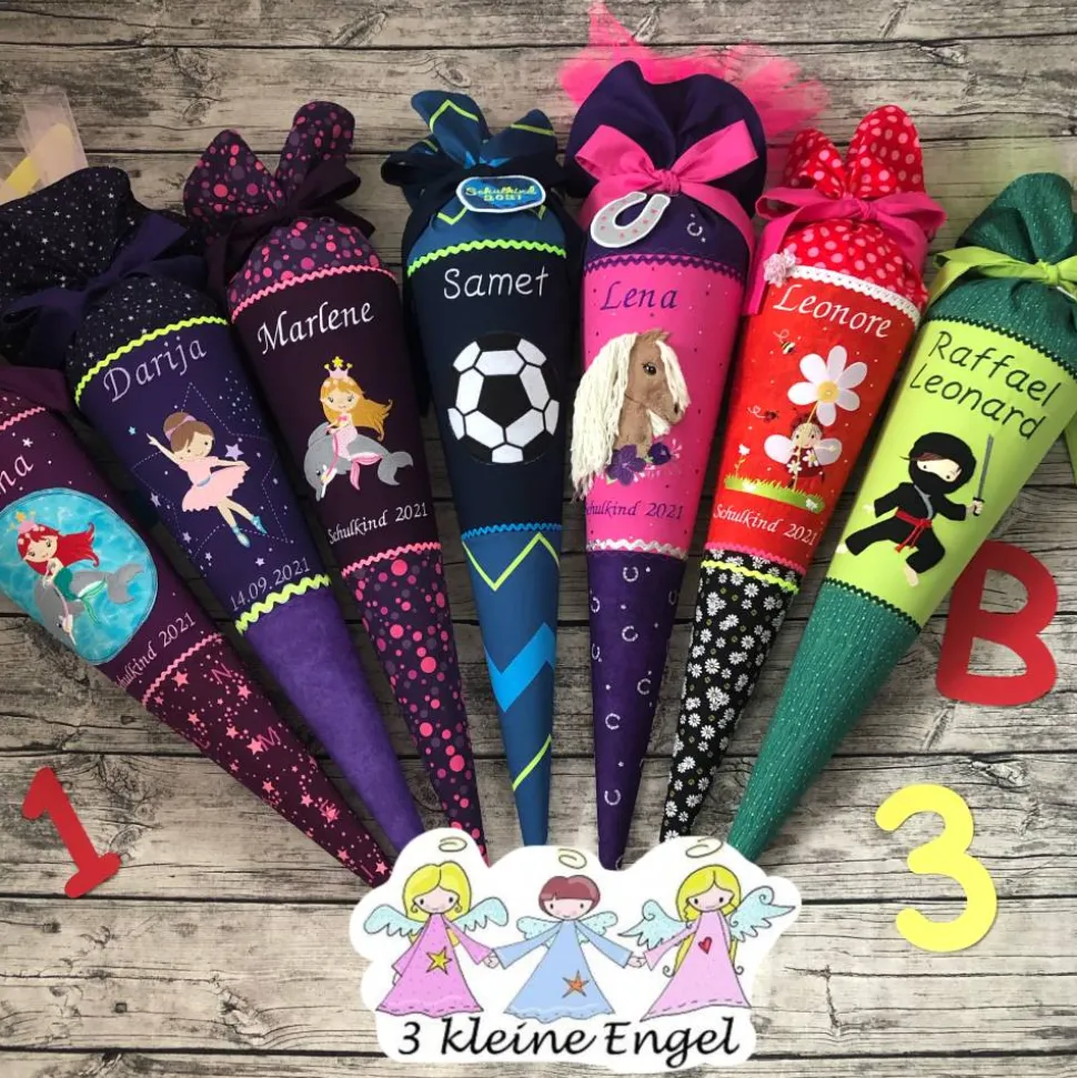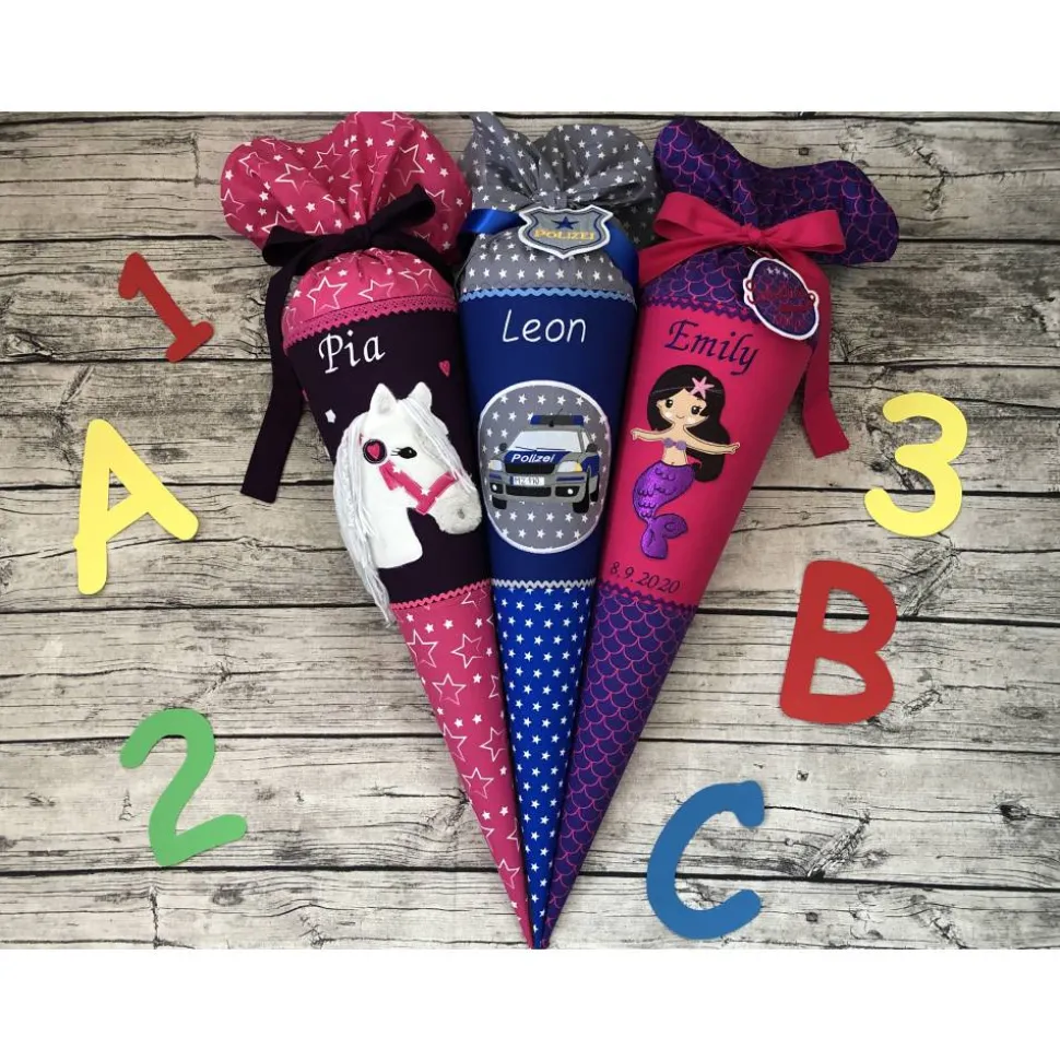 Hier habe ich ein ganz besonderes Angebot für euch, ich erstelle euch eine Schultüte ganz nach euren Wunschvorgaben. Ihr dürft, Wunschfarben und Thema an mich weiter geben und ich zaubere euch ein ganz persönliches Unikat. Außerdem fertige ich auch passend zum Ranzen, schickt mir einfach ein Foto eures Ranzens oder nennt mir das genaue Modell und ich fertige eine Schultüte passend zum Ranzen.