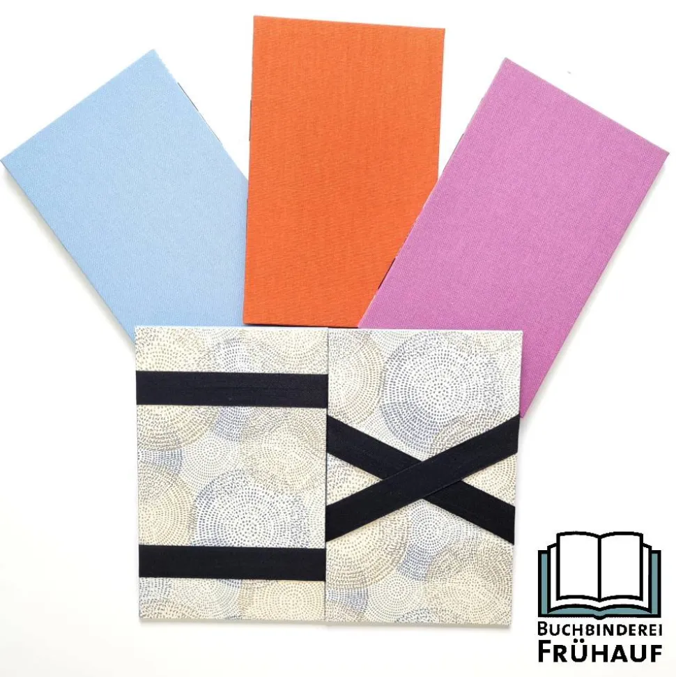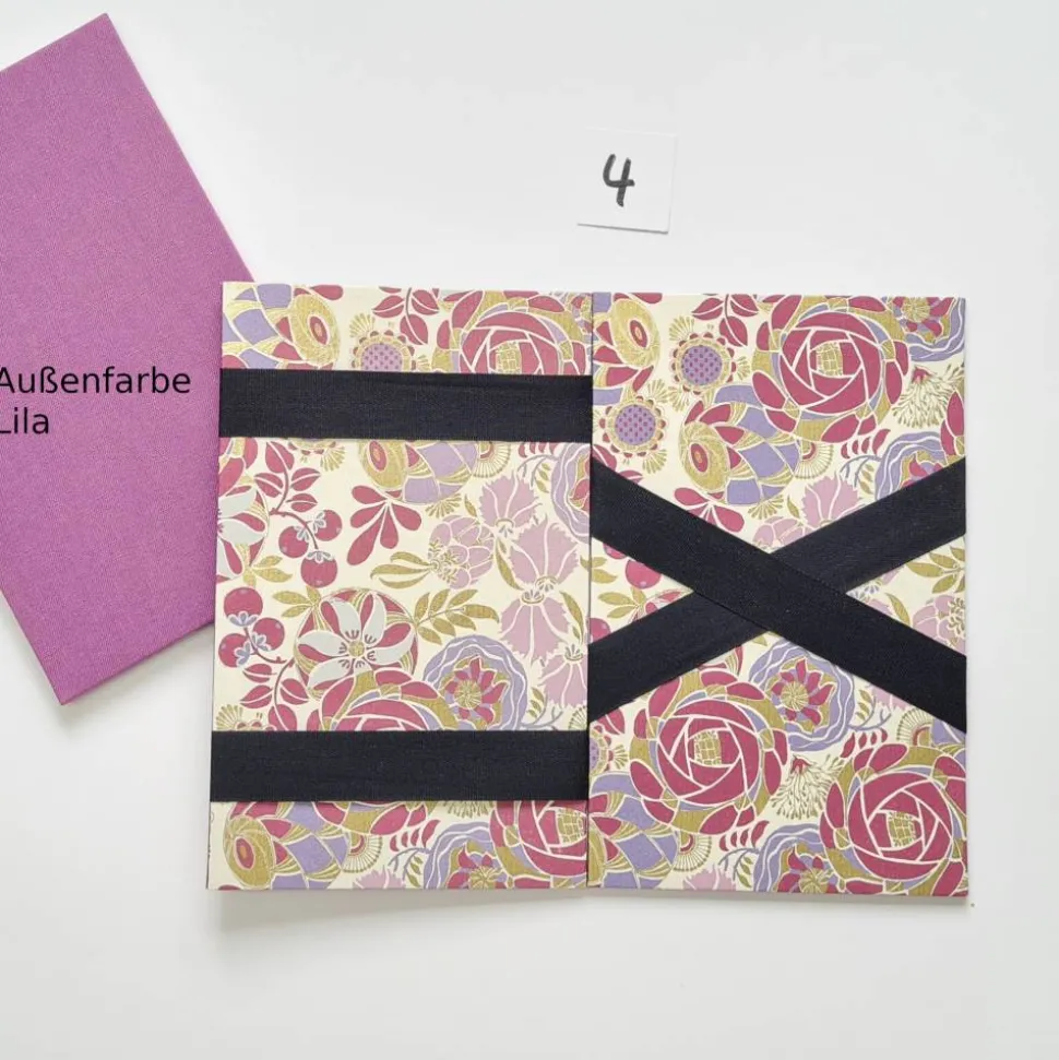 Außen überzogen mit Iris Buchbinderleinen, innen mit wunderschönen Buntpapieren.