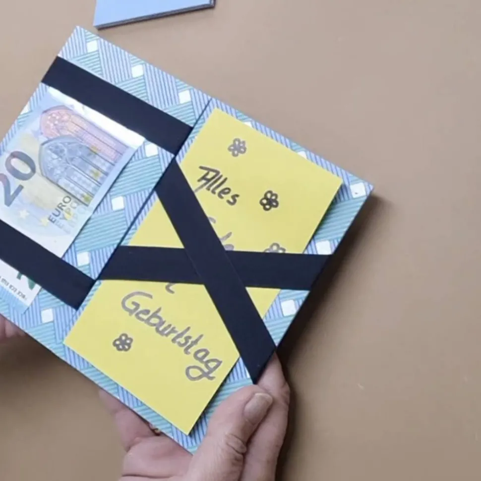 Nach dem ersten Öffnen liegt der lose eingelegte Geldschein unter den Bändern und wechselt wie von Zauberhand die Seite. Je nachdem von welcher Seite man das Zaubermäppchen öffnet, liegt er einmal unter den gekreuzten Bändern das andere mal unter den parallelen Bändern. Man kann auch noch ein paar geschriebene Worte oder Glückwünsche beilegen.